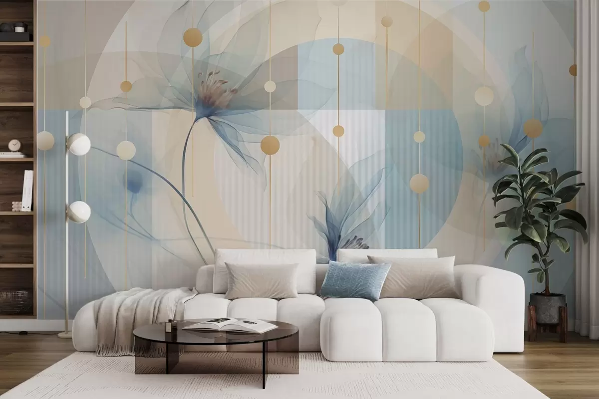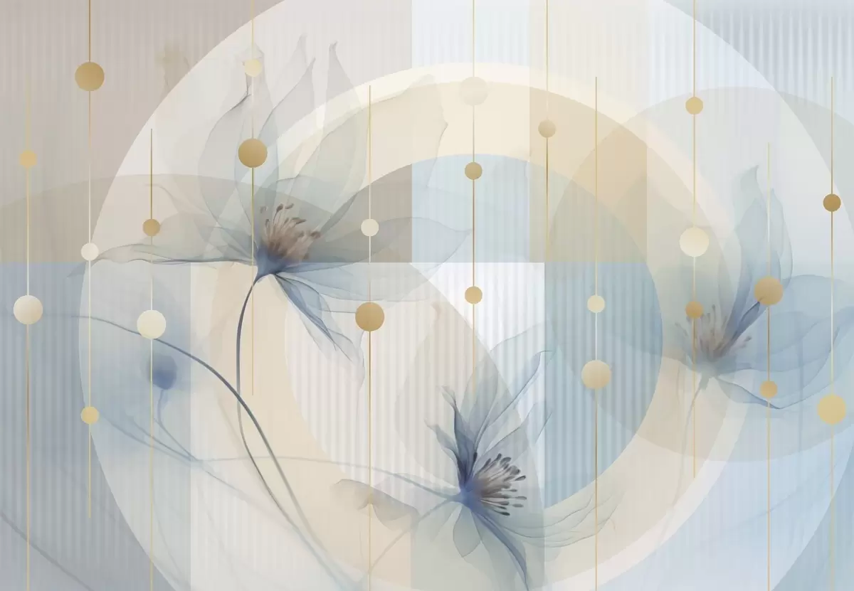 Peintures murales Fleurs abstraites translucides, cercles et formes géométriques, palette de couleurs bleu pastel, beige et blanc Nr. w09419