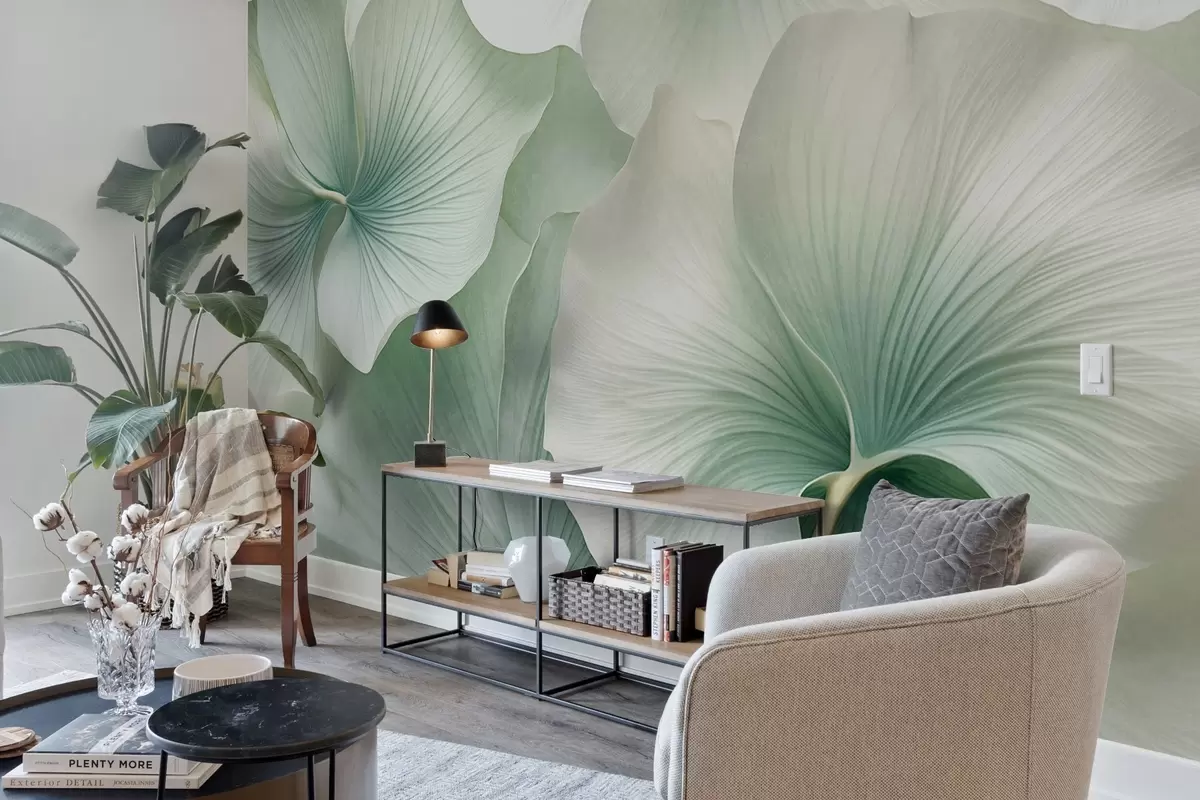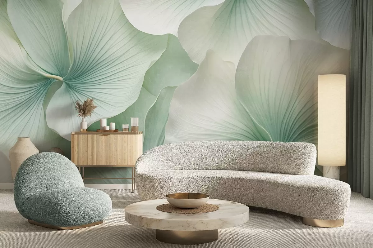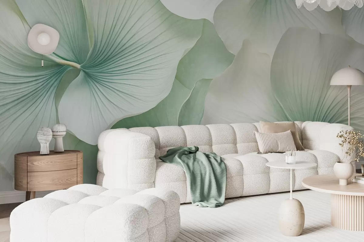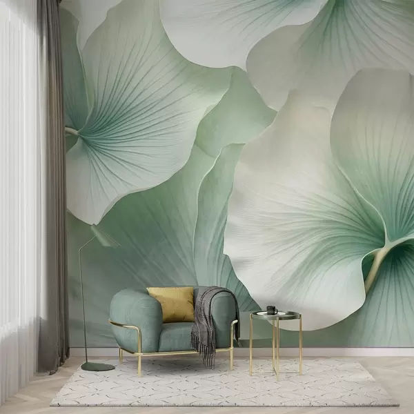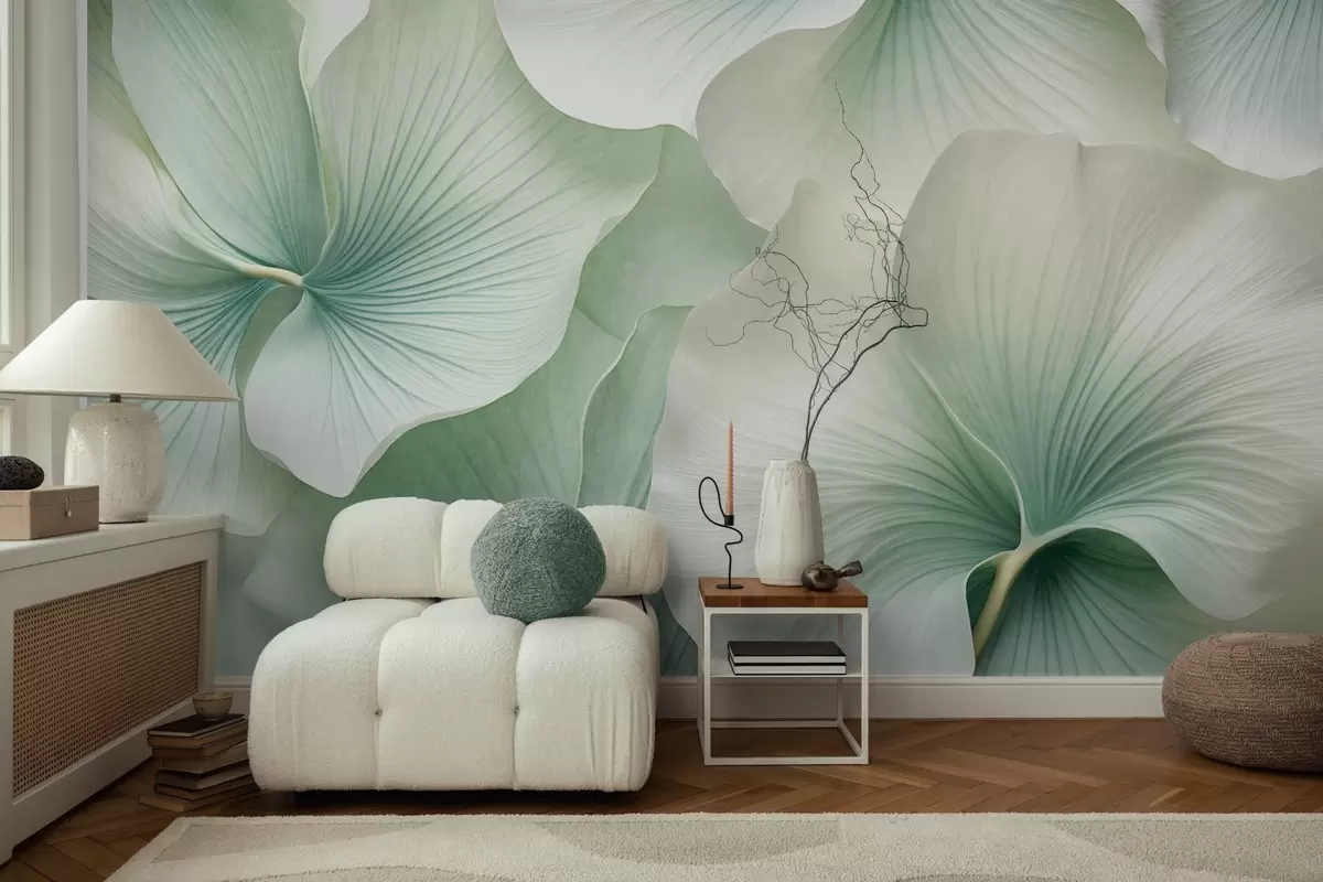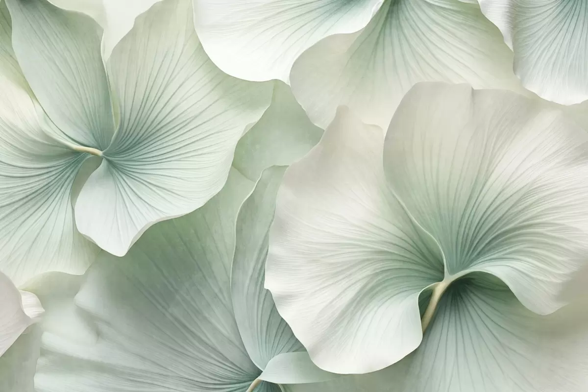 Peintures murales Feuilles de ginkgo blanches et vertes, texture douce, fond floral abstrait, style minimaliste moderne Nr. w09421