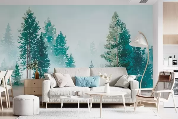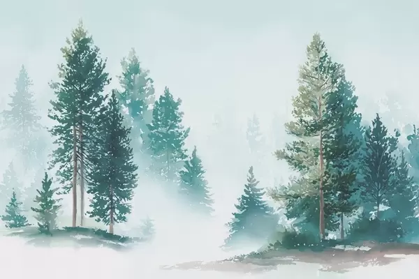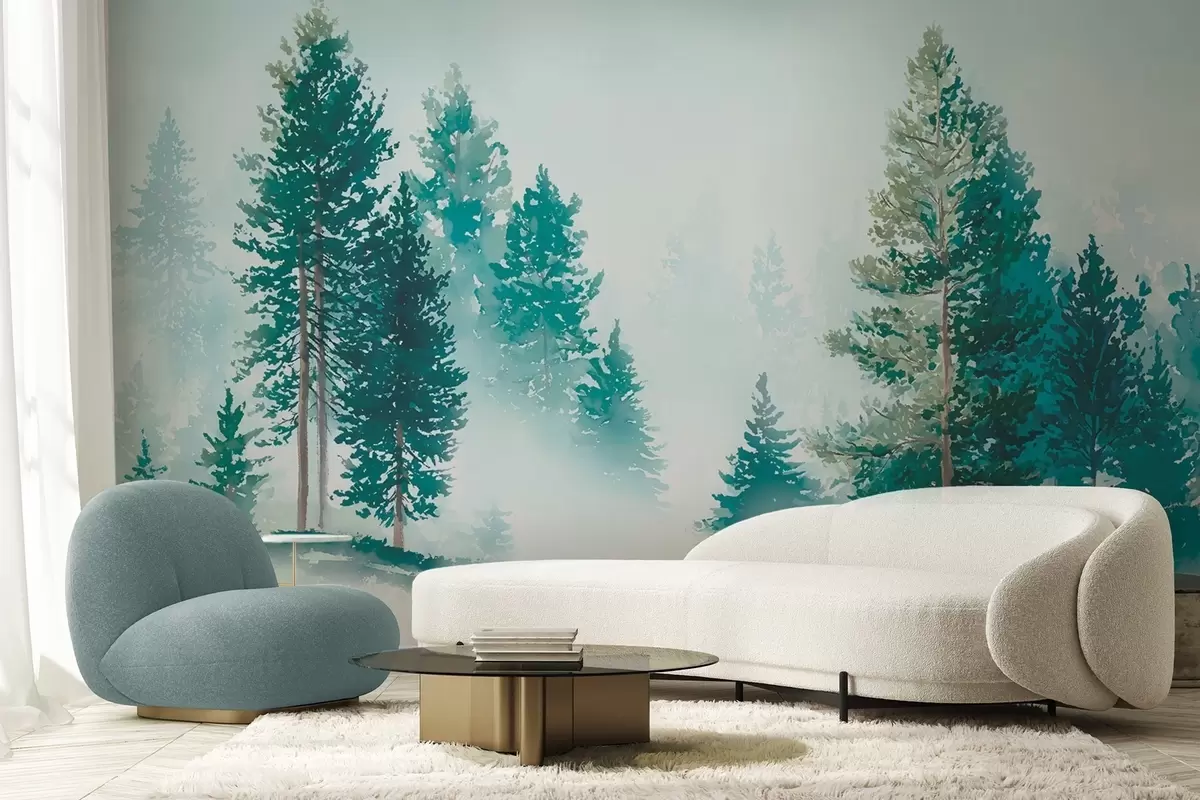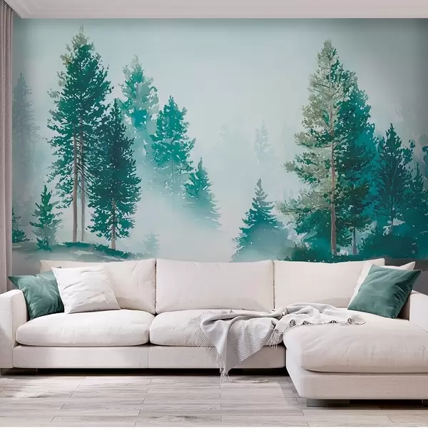 Peintures murales Forêt de pins brumeuse dans un style aquarelle Nr. w09444
