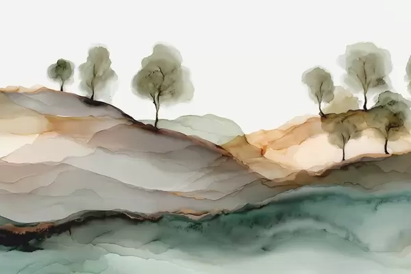 Peintures murales Paysage abstrait dans le style de l'encre à alcool — collines et arbres dans des tons pastel Nr. w09457