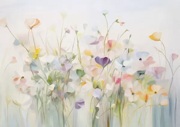 Peintures murales Champ abstrait de fleurs bleues et brunes avec de longues tiges et feuilles, texturé, couleurs pastel et douces Nr. w09466v1