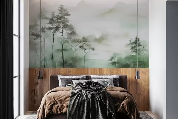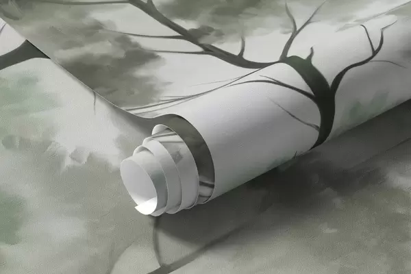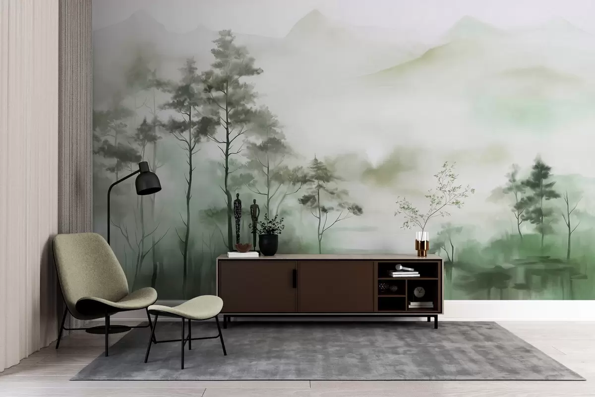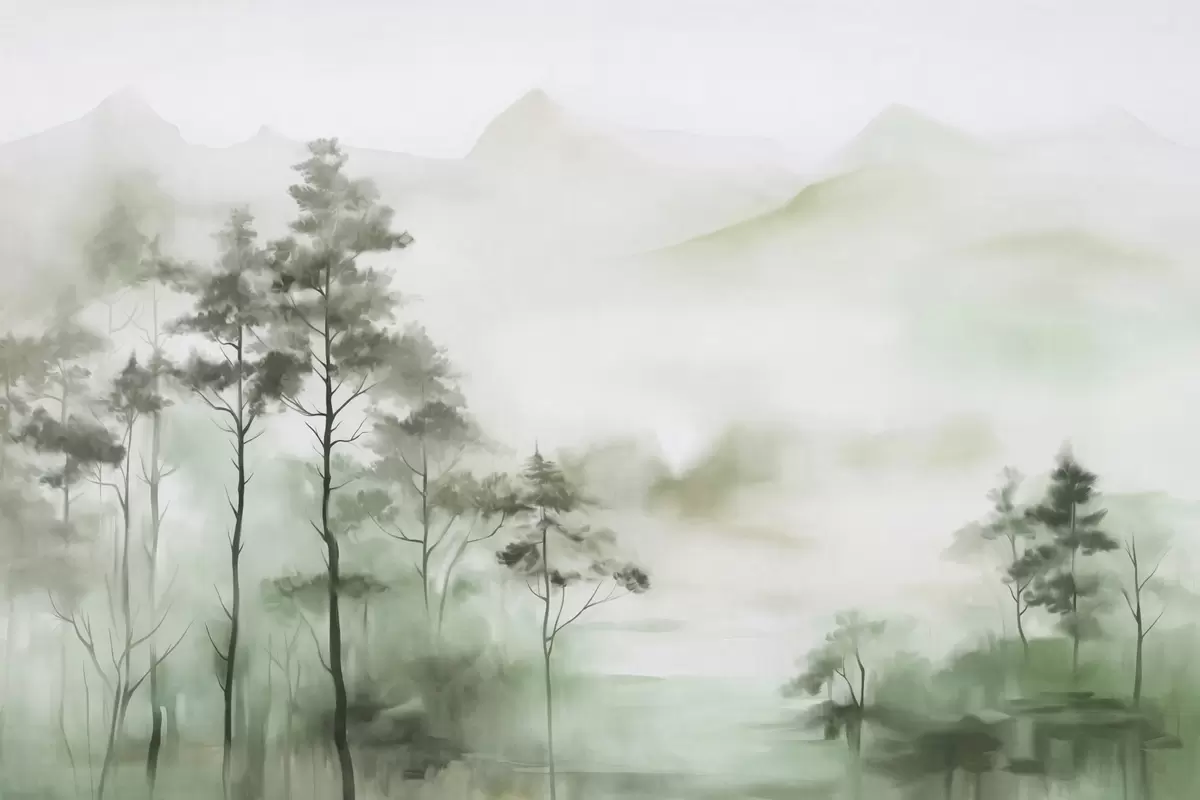 Peintures murales Paysage brumeux avec de grands arbres et des montagnes aux tons verts et gris discrets, style minimaliste, texturé Nr. w09469