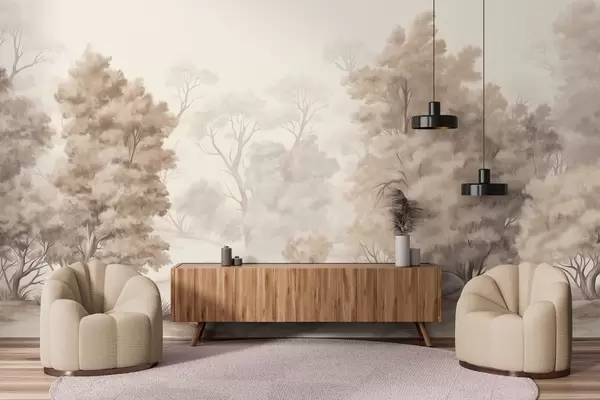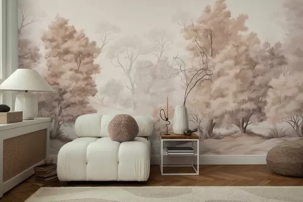 Peintures murales Peinture paysagère texturée imitant une forêt avec de grands arbres et de l'herbe, couleurs douces et discrètes, scène apaisante Nr. w09474