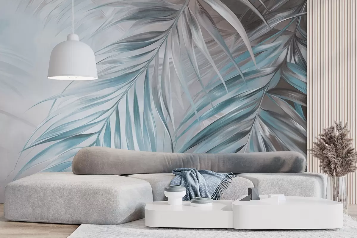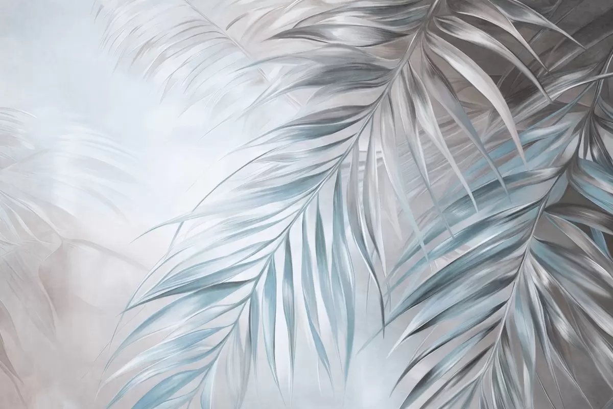 Peintures murales Feuilles de palmier aux tons gris et bleus, fond légèrement texturé aux couleurs douces, style tropical élégant Nr. w09475v1