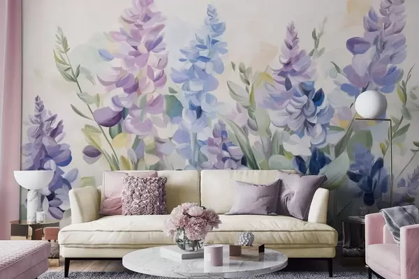 Peintures murales Fleurs violettes et bleues texturées avec des feuilles bleues, fond clair, coups de pinceau doux, couleurs vives Nr. w09482