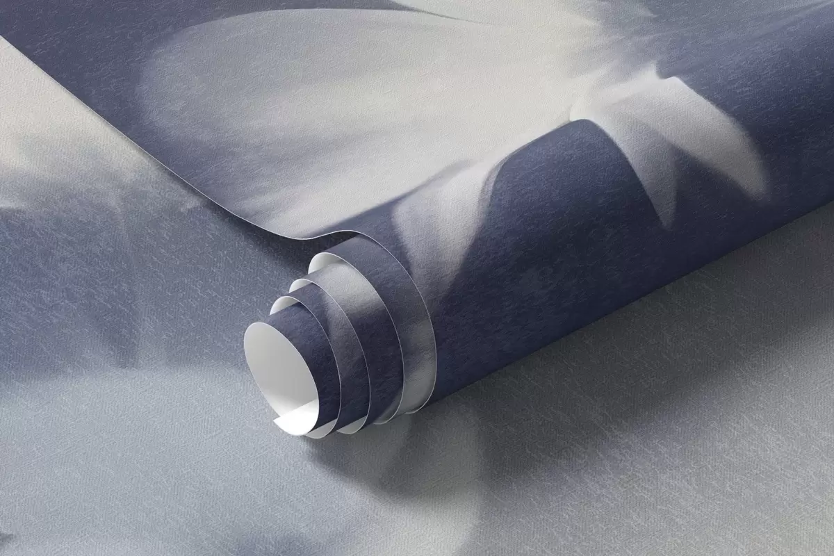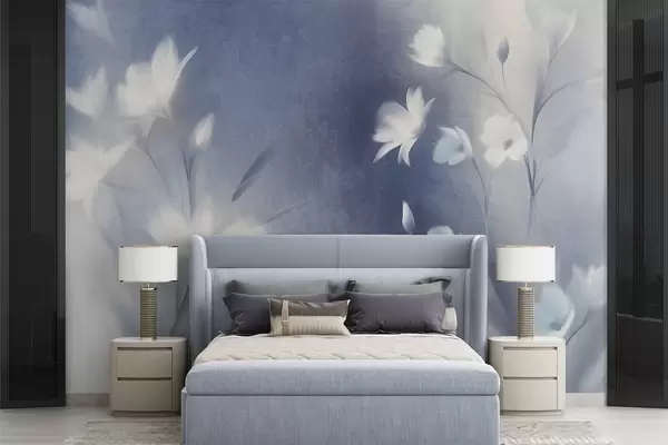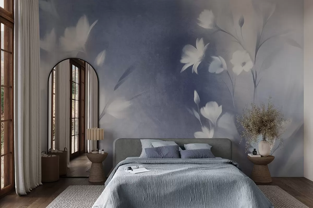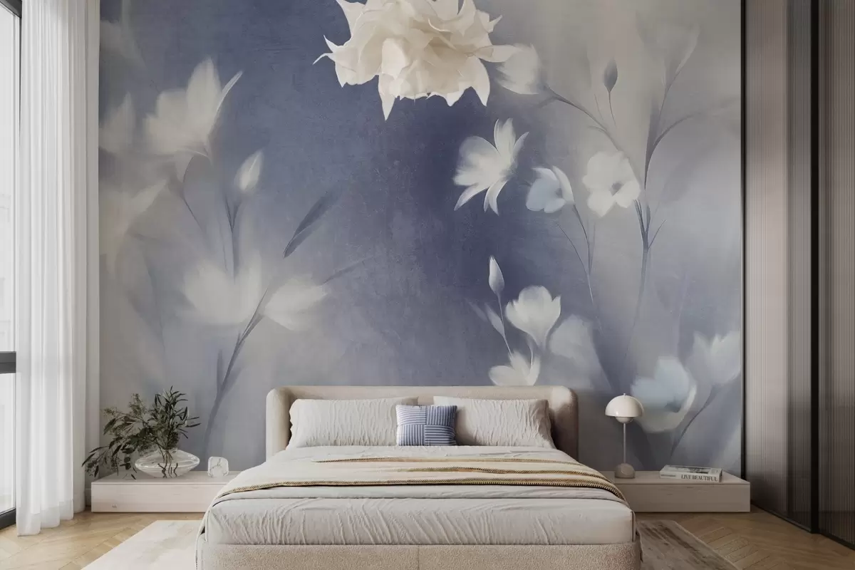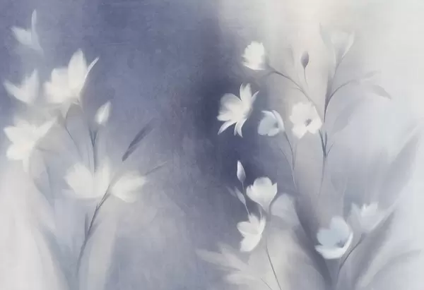 Peintures murales Fleurs blanches texturées à longues tiges, boutons délicats sur fond flou aux teintes bleues et blanches Nr. w09484