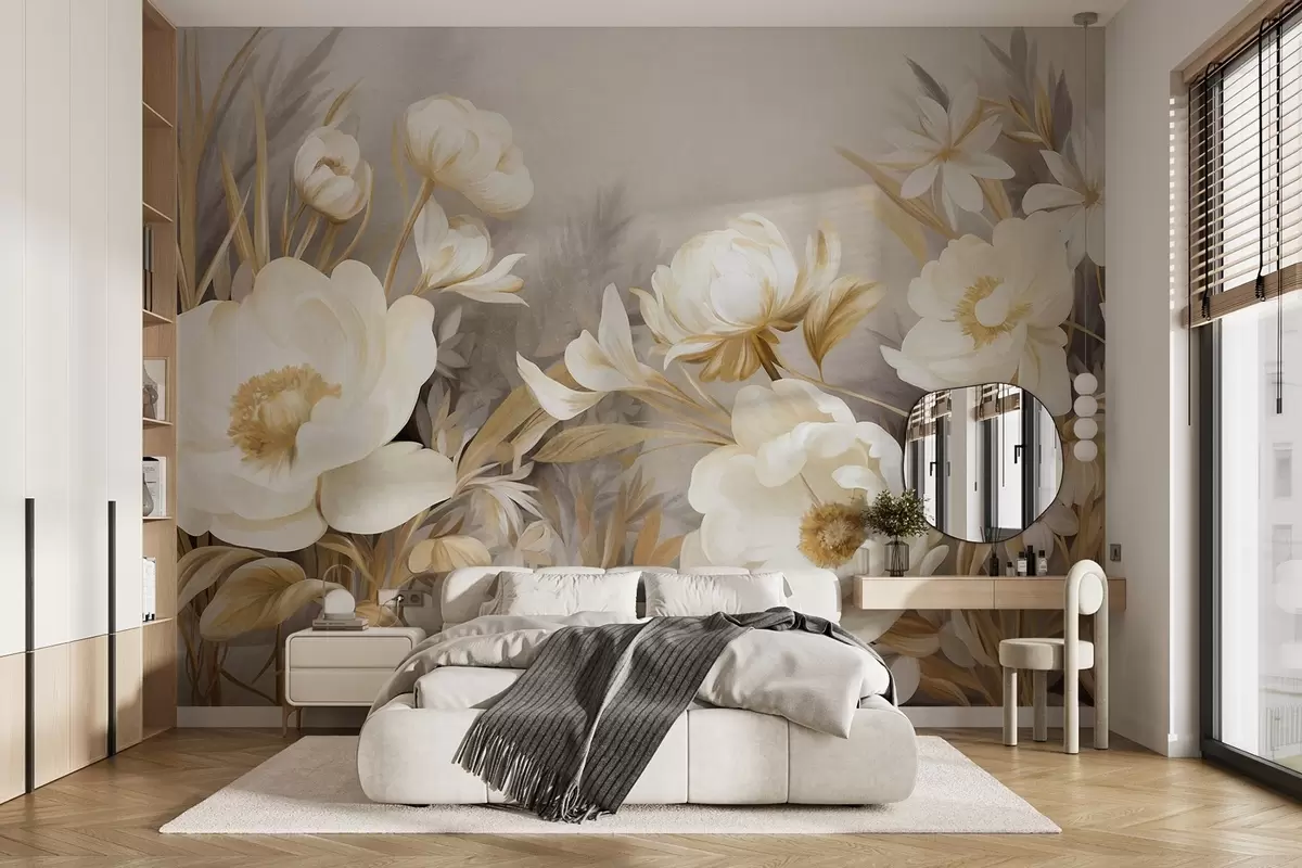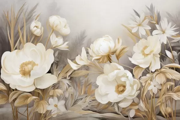 Peintures murales Pivoines blanches et jaunes et autres fleurs avec de hautes herbes et des feuilles dans un style doux et pictural. Nr. w09494