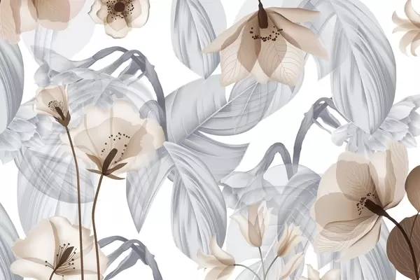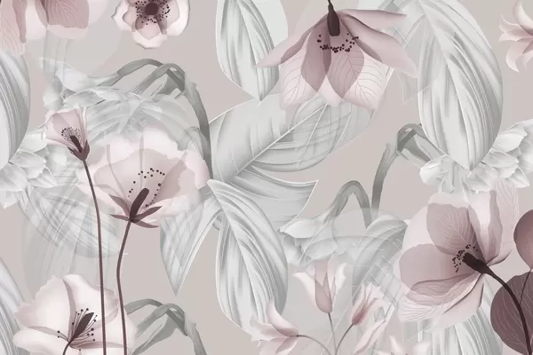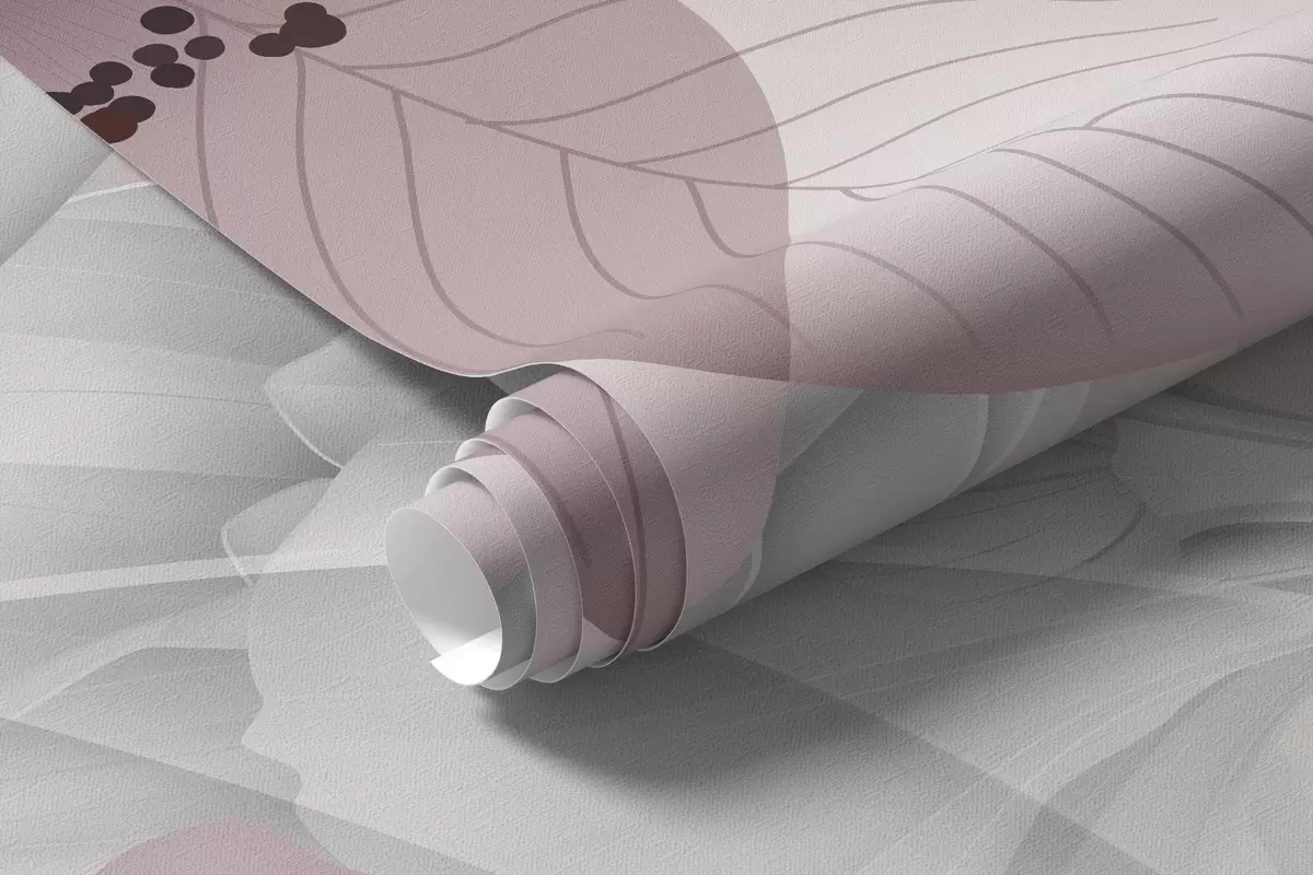 Peintures murales Fleurs roses et feuilles grises, fond botanique floral, design élégant, couleurs douces, détails légers et délicats Nr. w09497