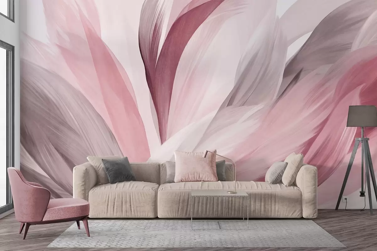 Peintures murales Plumes abstraites texturées dans les tons rose, blanc, gris et diverses nuances, se superposant sur un fond blanc. Nr. w09531v2