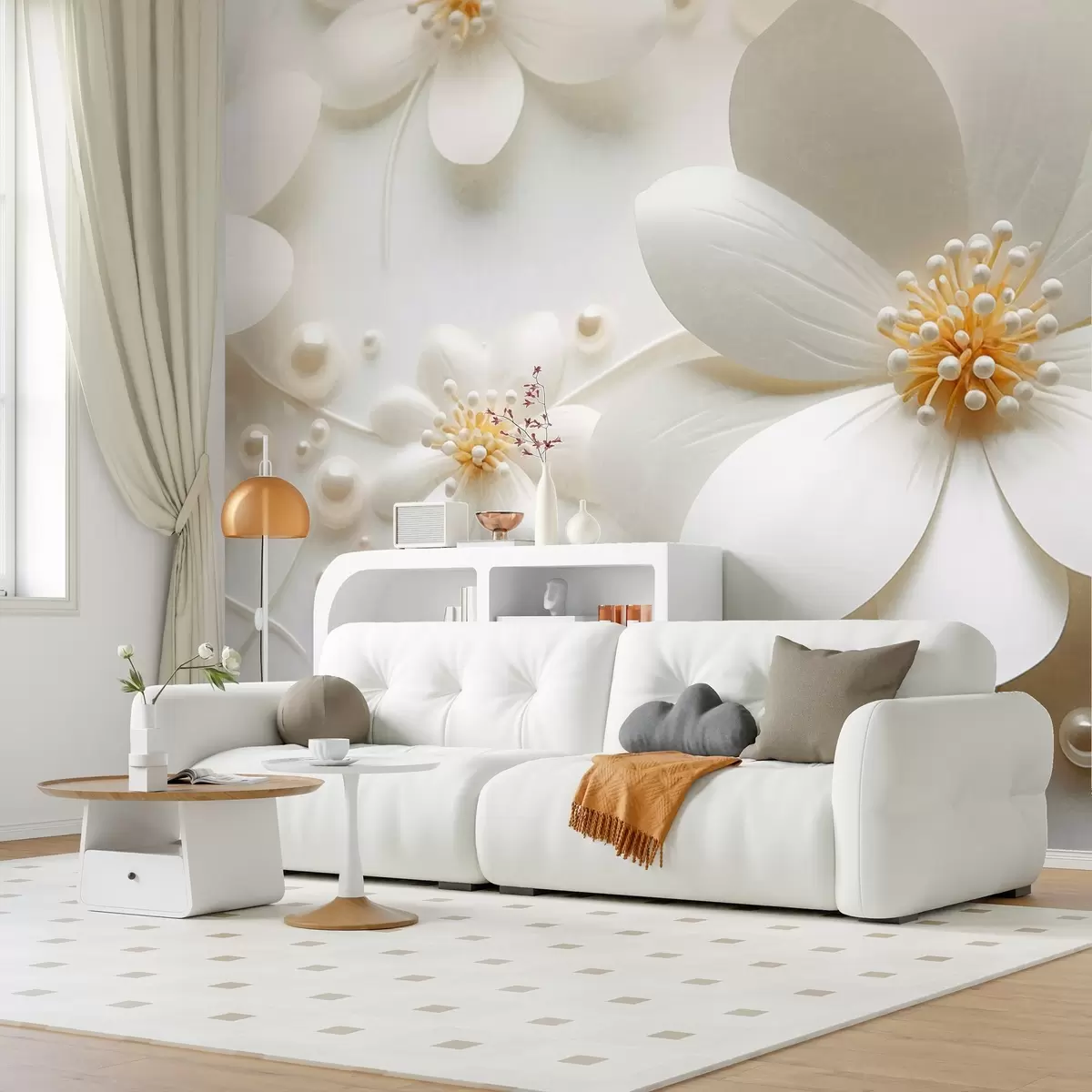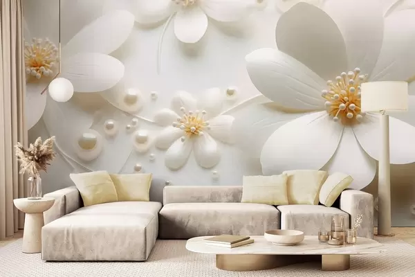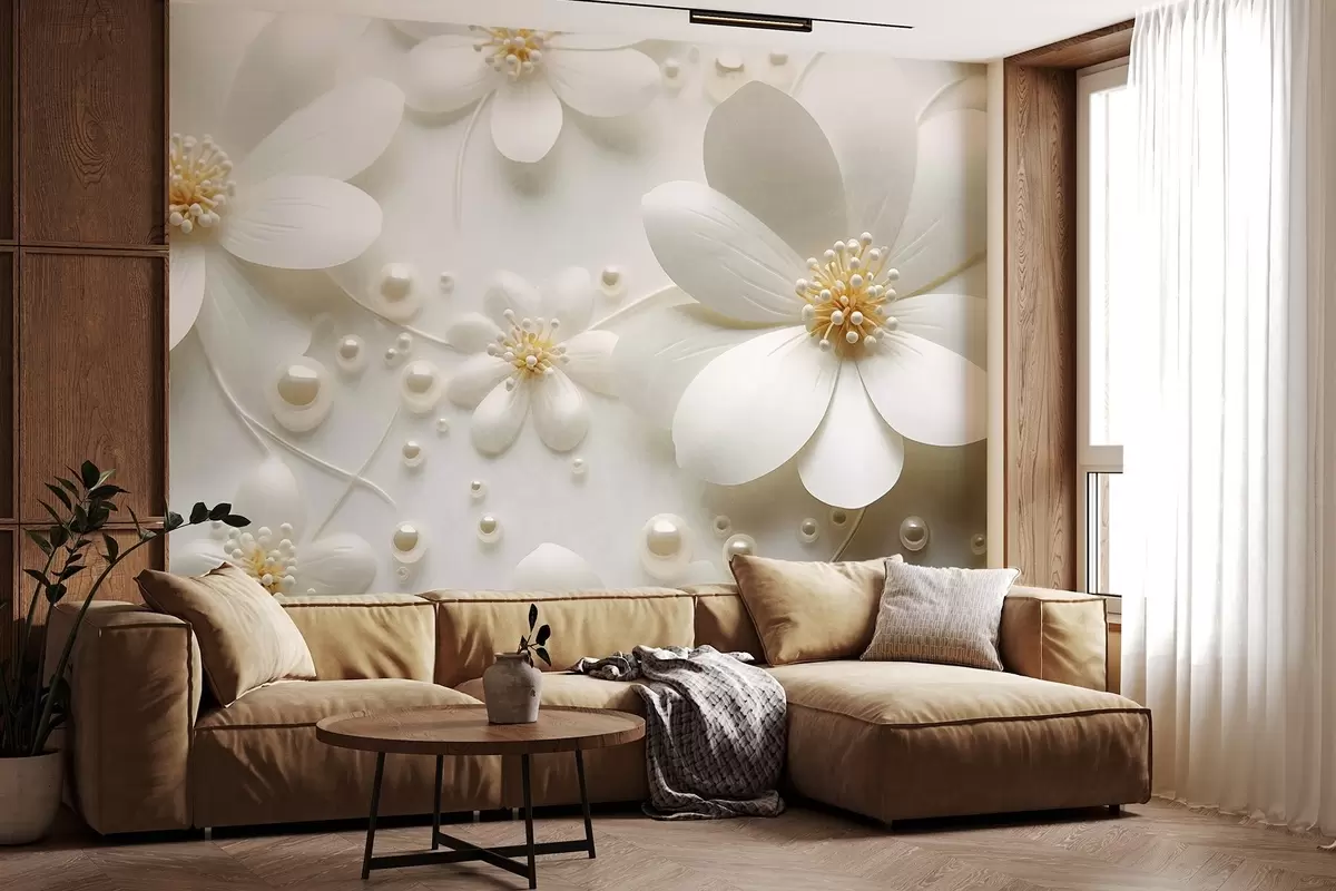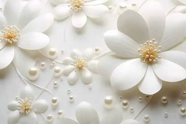 Peintures murales Fleurs blanches avec des perles dispersées sur un fond blanc, design élégant et minimaliste, texturé Nr. w09535
