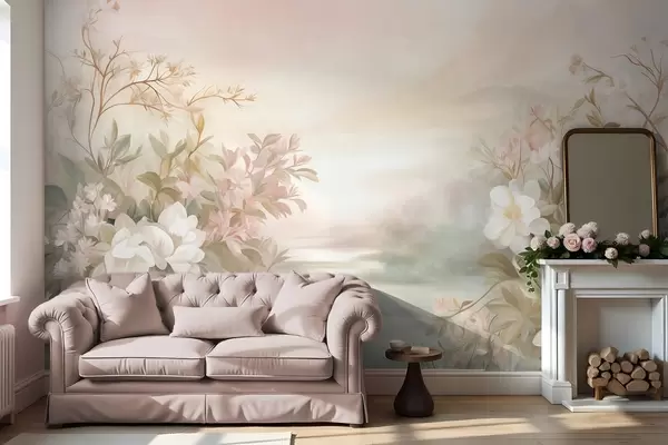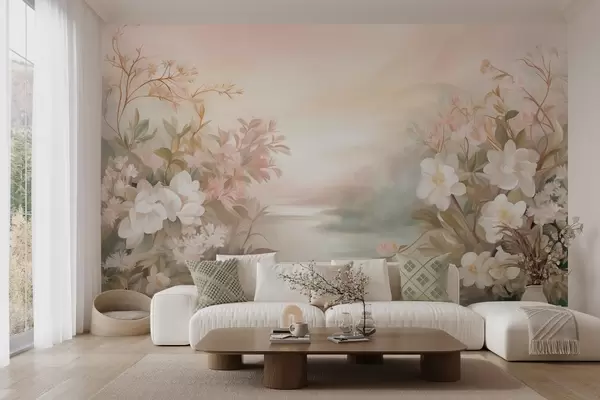 Peintures murales Un paysage avec une rivière entourée de fleurs et de plantes, des couleurs douces, un ciel rose, un style aquarelle texturé. Nr. w09537