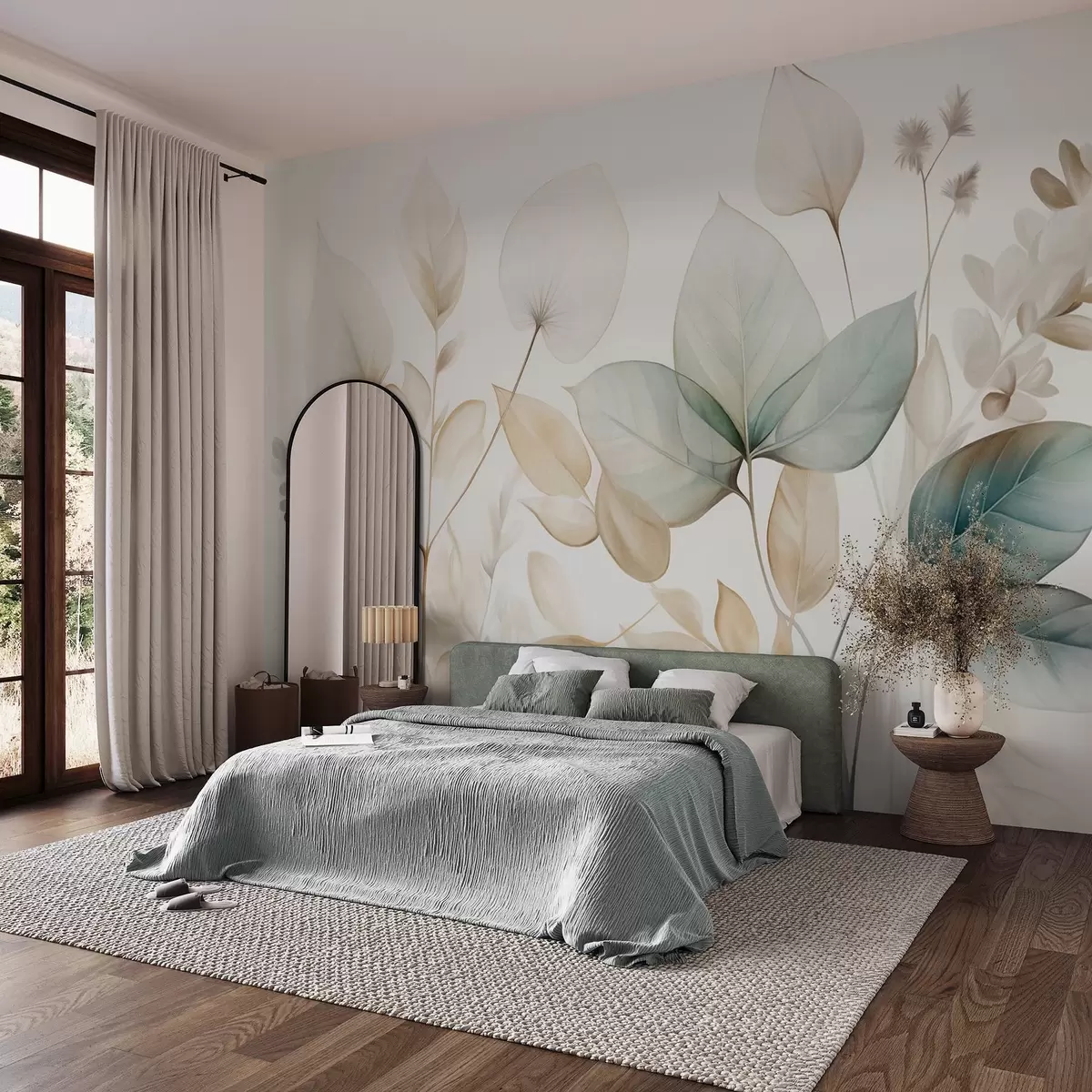 Peintures murales Feuilles texturées translucides dans des tons discrets de beige et de bleu sarcelle, avec des tiges délicates sur un fond doux et clair. Nr. w09583
