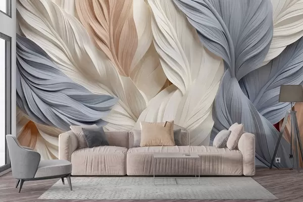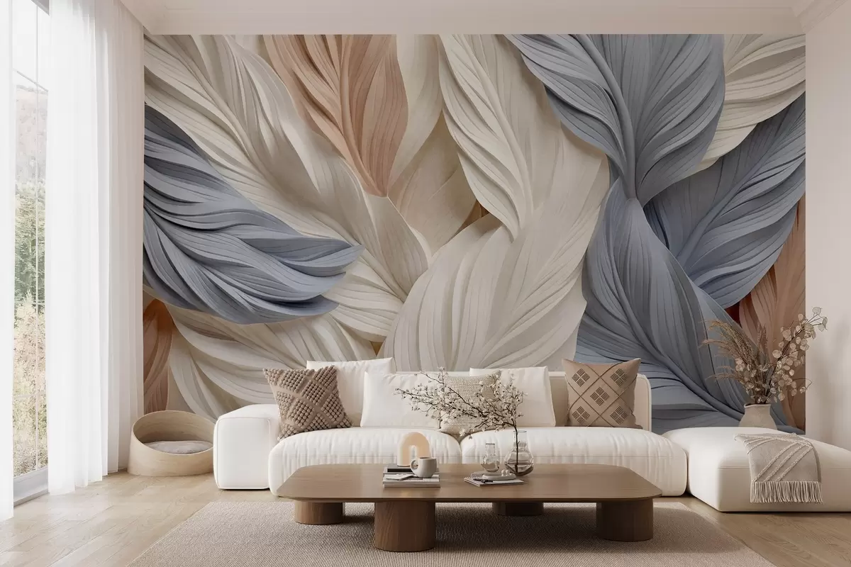 Peintures murales Plumes abstraites et superposées dans des tons crème, beige et bleu clair, avec un aspect texturé et organique. Nr. w09603