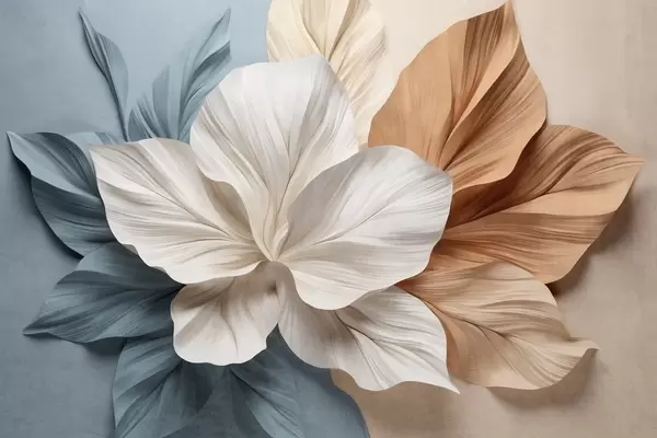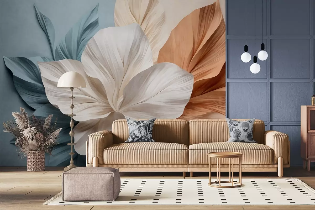Peintures murales Fleur abstraite à plusieurs pétales avec des feuilles texturées dans des tons pêche et bleu, fond doux Nr. w09604