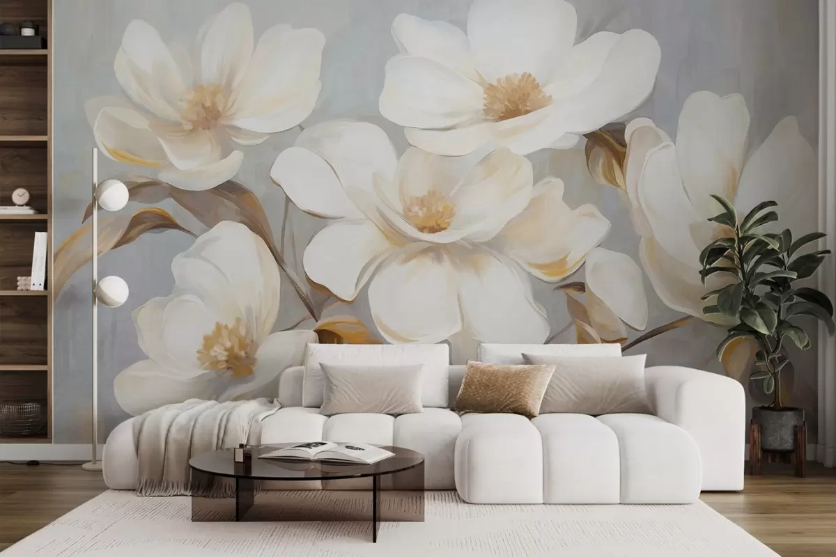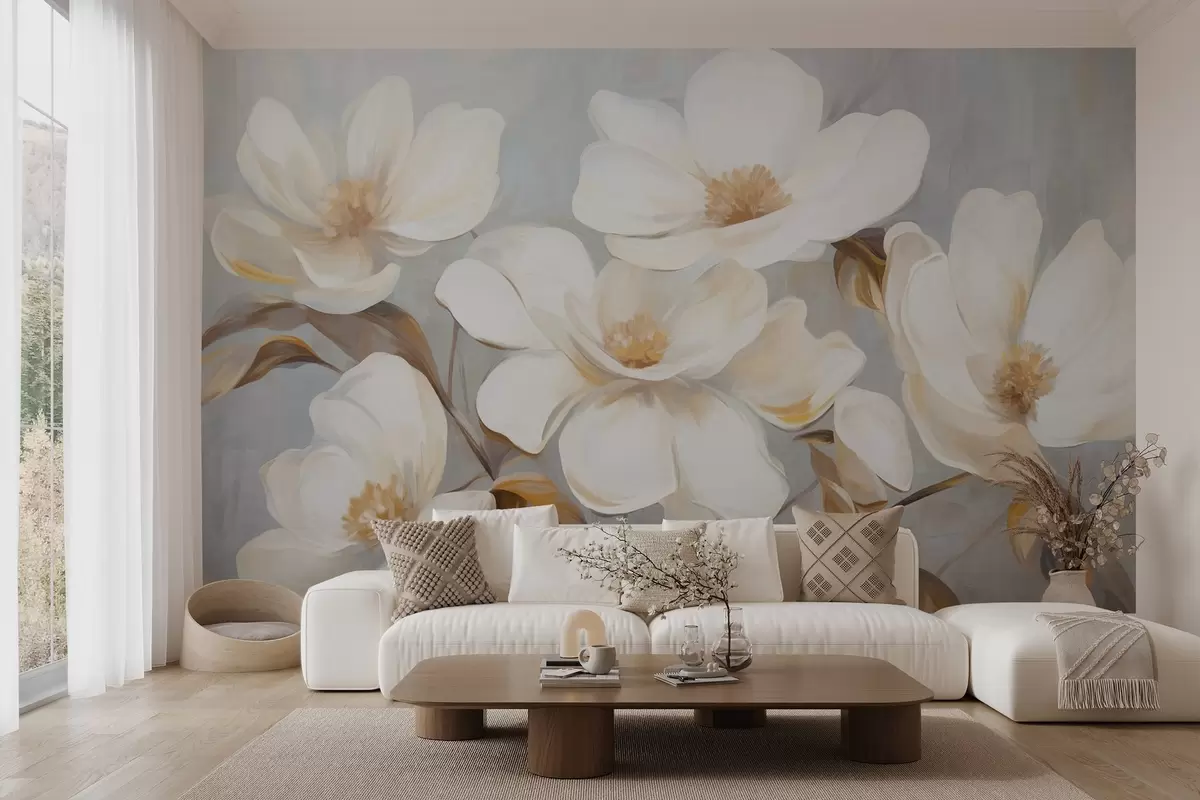 Peintures murales Une imitation picturale texturée de plusieurs fleurs de magnolia blanches sur un fond pastel discret. Nr. w09612