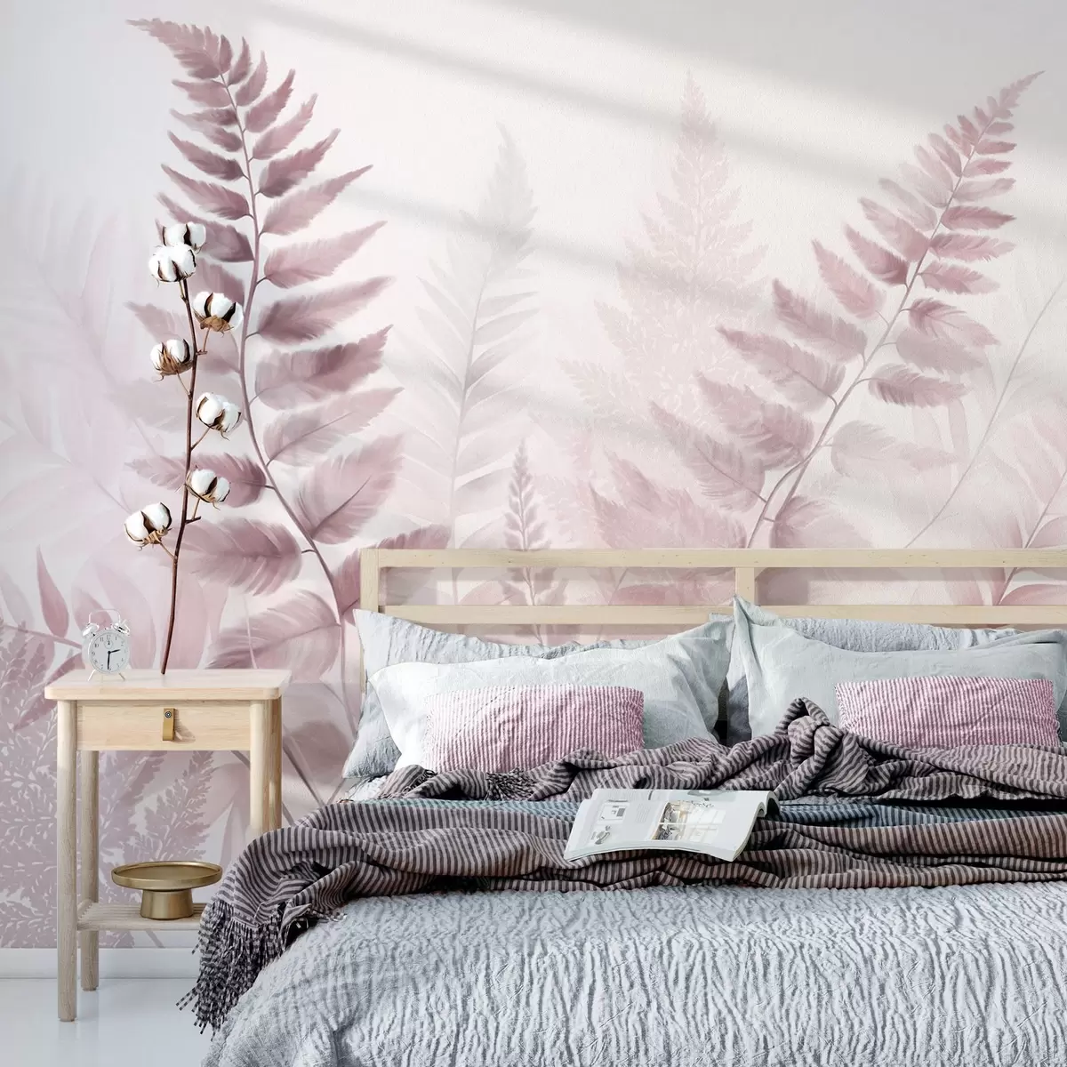 Peintures murales Fougères séchées texturées dans différentes nuances de rose, sur un fond doux et clair de style aquarelle. Nr. w09615v2