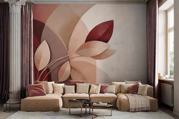 Murale Branche abstraite texturée avec des feuilles dans les tons marron, beige et rouge, sur un fond de formes abstraites. w09618