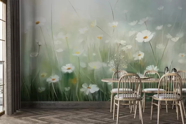 Peintures murales Champ abstrait de marguerites blanches avec de l'herbe verte et un arrière-plan doux et brumeux dans un style pictural Nr. w09619