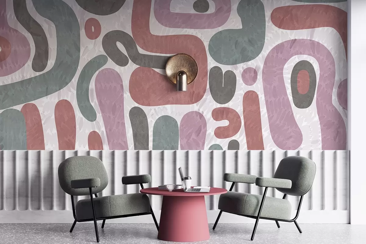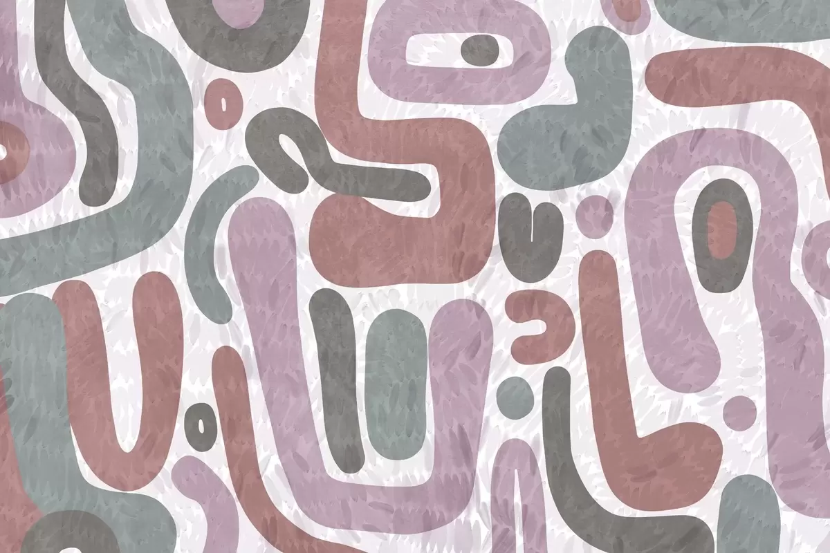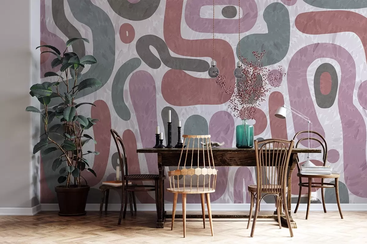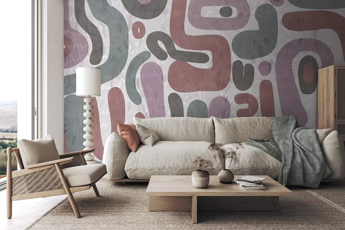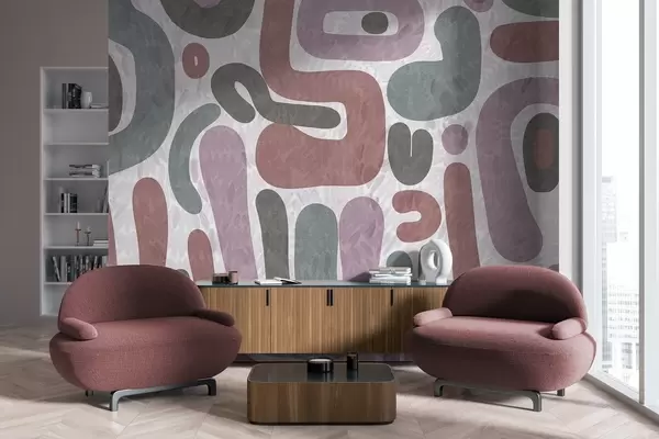 Peintures murales Formes abstraites texturées dans des tons roses, verts et gris discrets, sur un fond texturé d'art moderne Nr. w09622