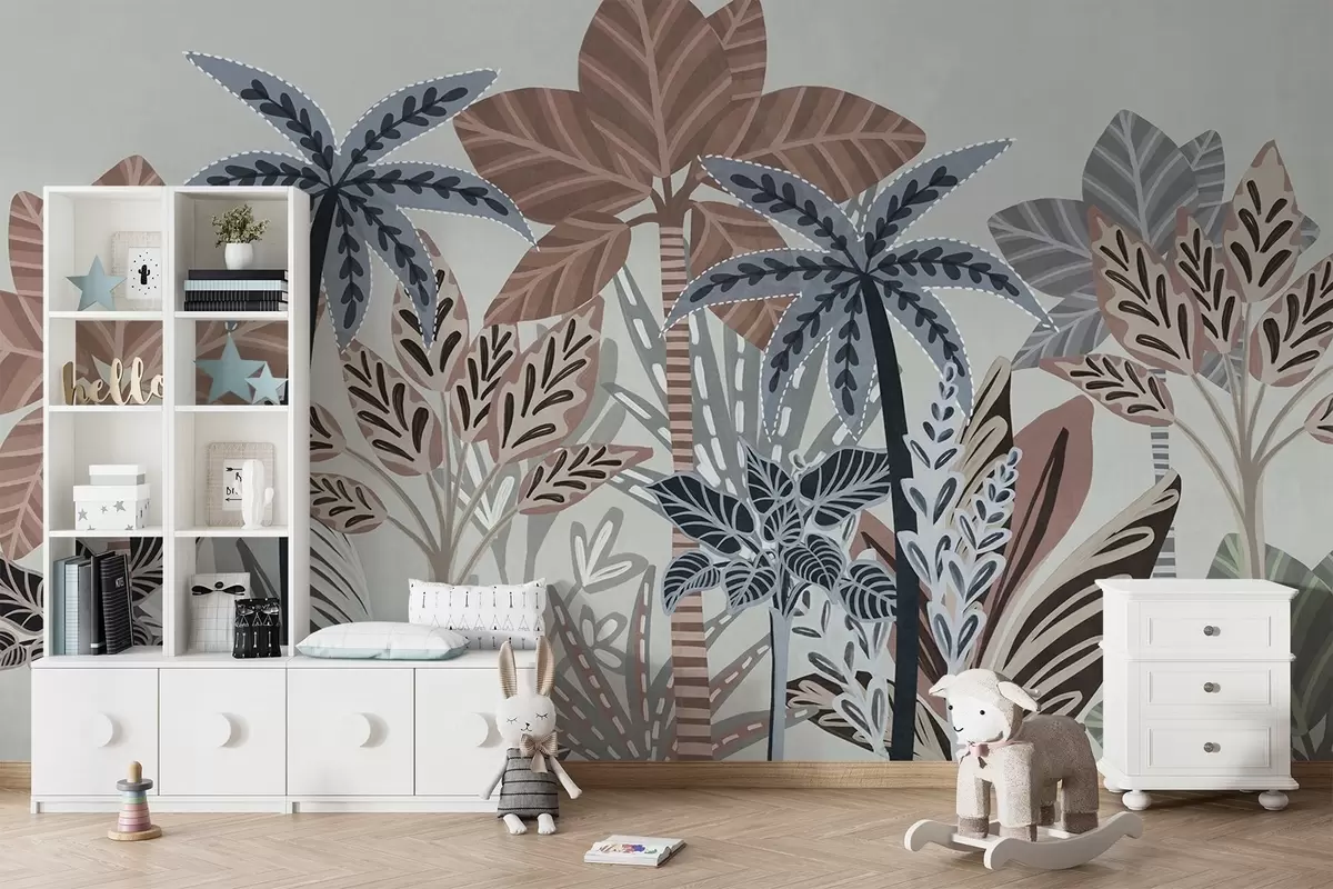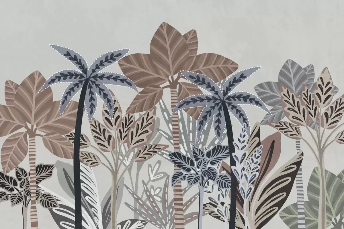 Peintures murales Plantes tropicales texturées et palmiers aux couleurs douces dans un style bohème décoratif sur fond gris Nr. w09639v1
