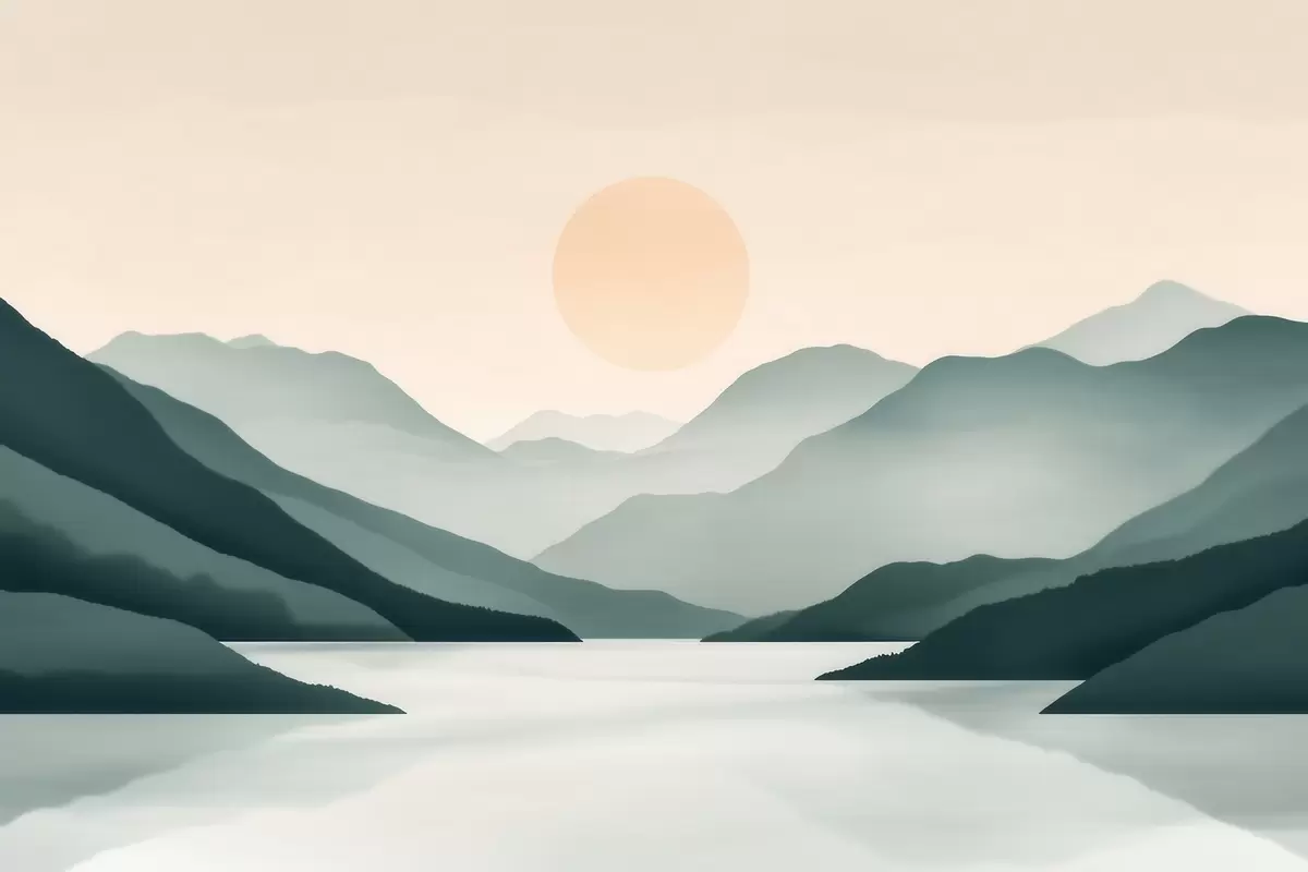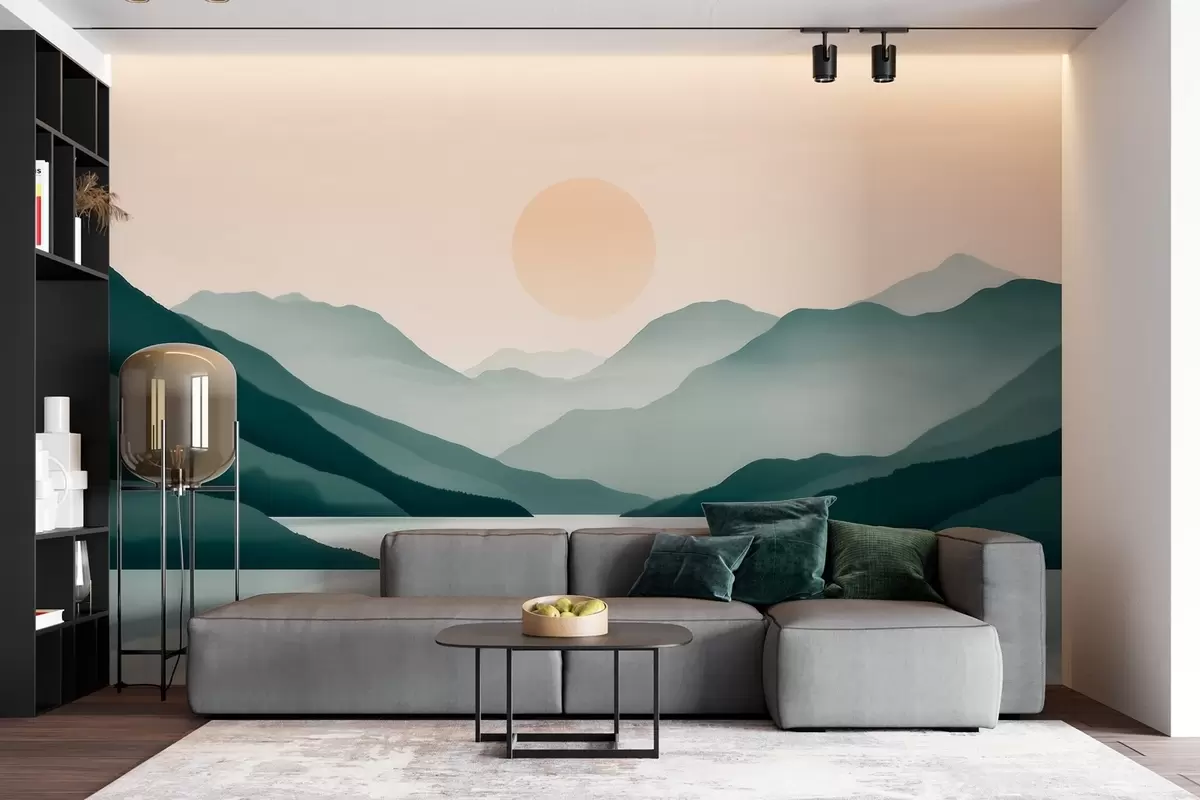 Peintures murales Paysage montagneux paisible avec le soleil sur le lac Nr. w09735