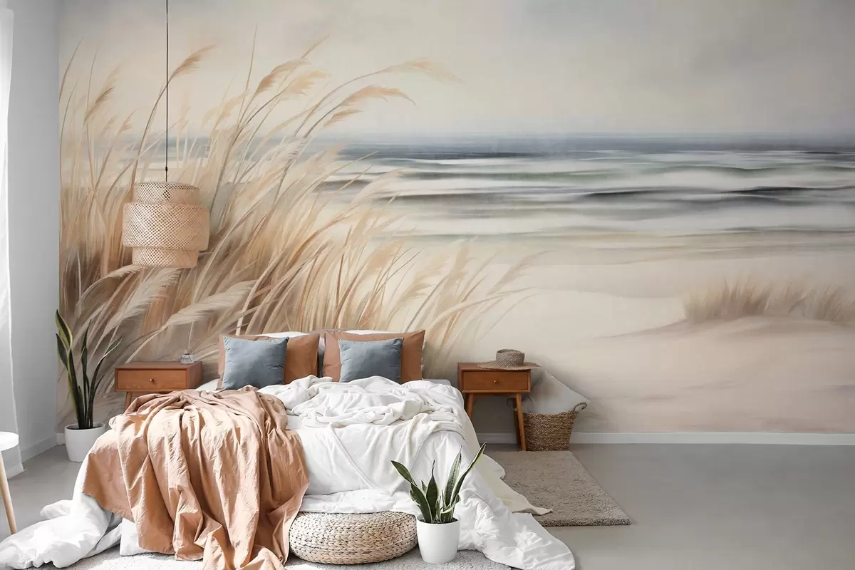 Peintures murales Paysage texturé avec de l'herbe sèche sur une plage de sable, avec l'océan et le ciel en arrière-plan Nr. w09739