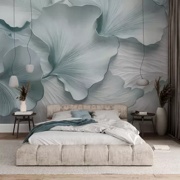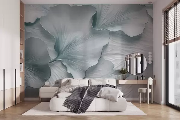 Peintures murales Pétales de feuilles de ginkgo texturées, bleues et blanches, avec un imprimé organique délicat Nr. w09741v1