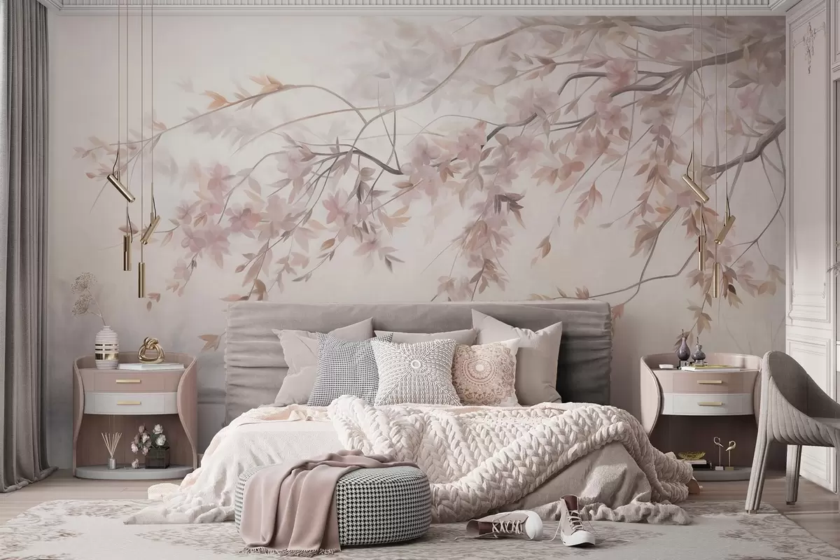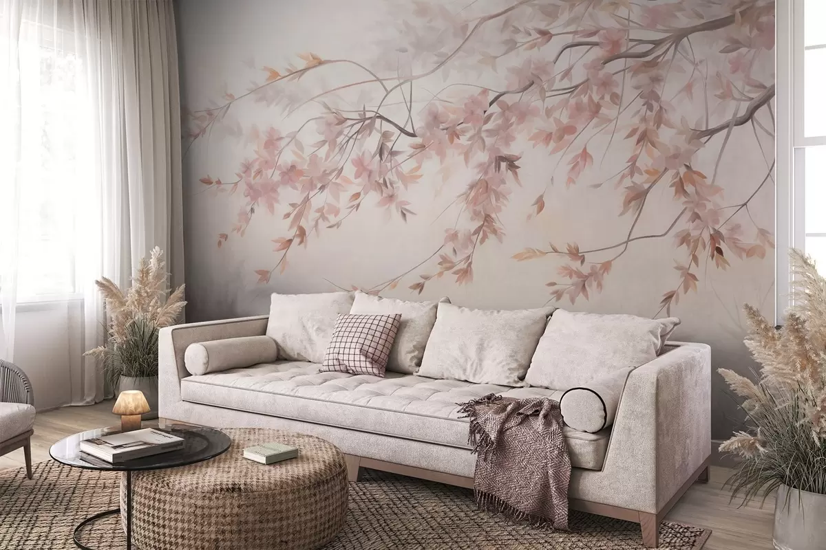 Peintures murales Paysage texturé avec branche de cerisier en fleurs, feuilles roses, arrière-plan doux et brumeux Nr. w09743