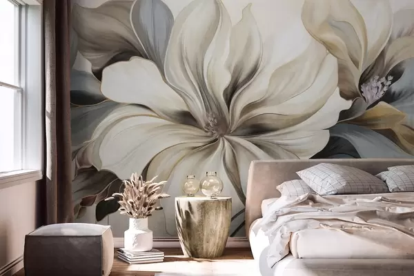 Peintures murales Grandes fleurs de magnolia crémeuses avec des feuilles brunes et grises, éclairage doux, arrière-plan abstrait Nr. w09749