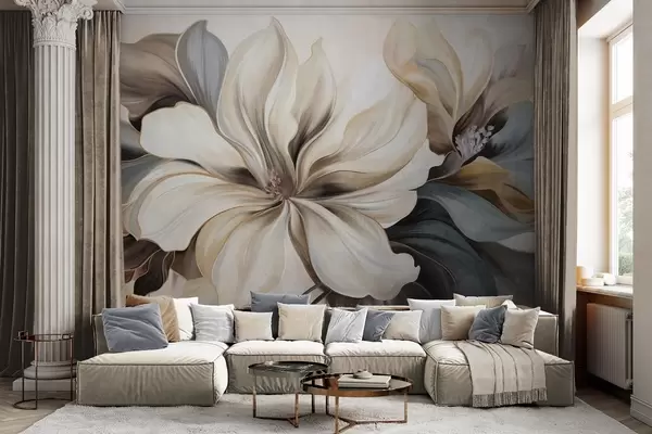 Peintures murales Grandes fleurs de magnolia crémeuses avec des feuilles brunes et grises, éclairage doux, arrière-plan abstrait Nr. w09749