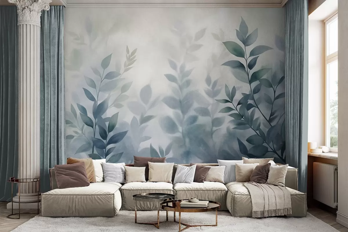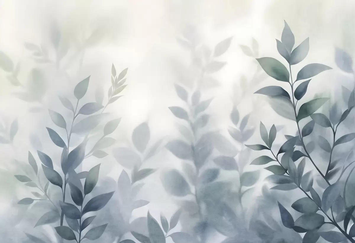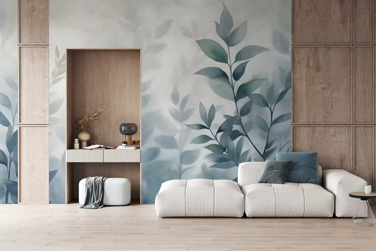 Peintures murales Branches délicates aux feuilles bleu pâle, style aquarelle, art texturé Nr. w09750v1
