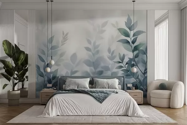 Peintures murales Branches délicates aux feuilles bleu pâle, style aquarelle, art texturé Nr. w09750v1