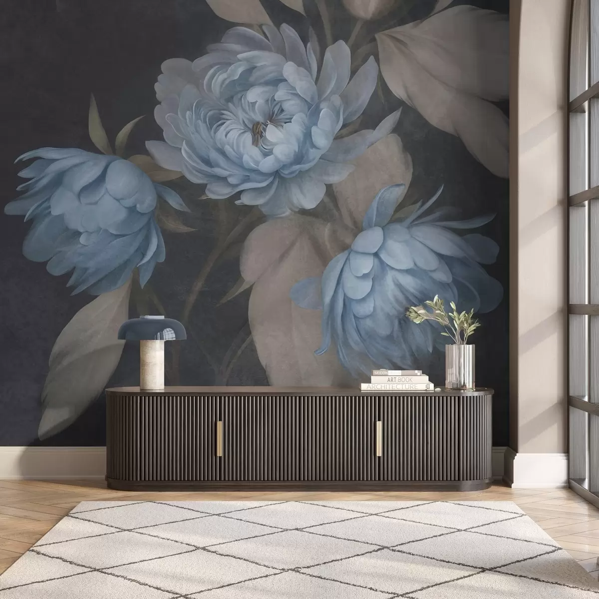 Peintures murales Des fleurs de pivoine bleu clair texturées, accompagnées de feuilles beiges, sur un fond sombre Nr. w09751