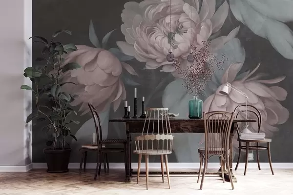 Peintures murales Des fleurs de pivoine rose pâle aux textures variées, accompagnées de feuilles vert pâle, sur un fond sombre Nr. w09751v1