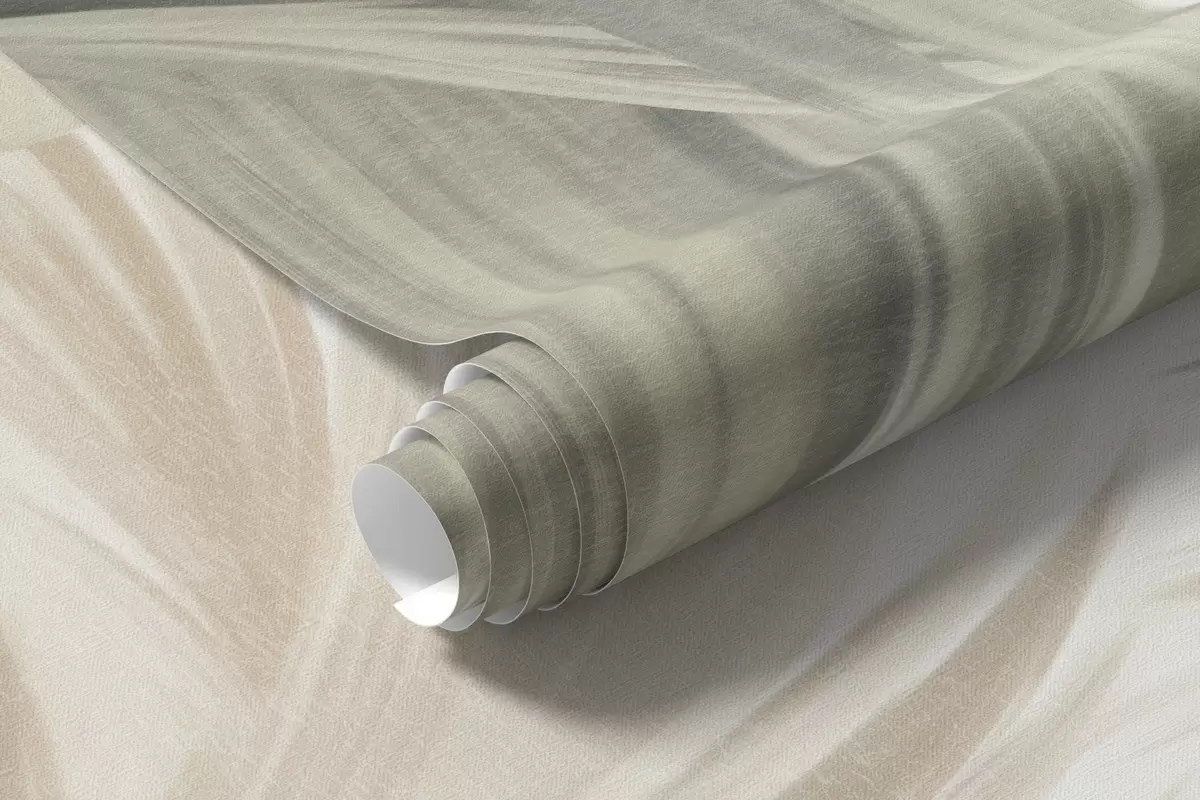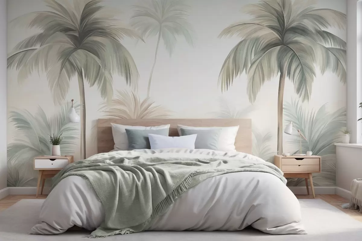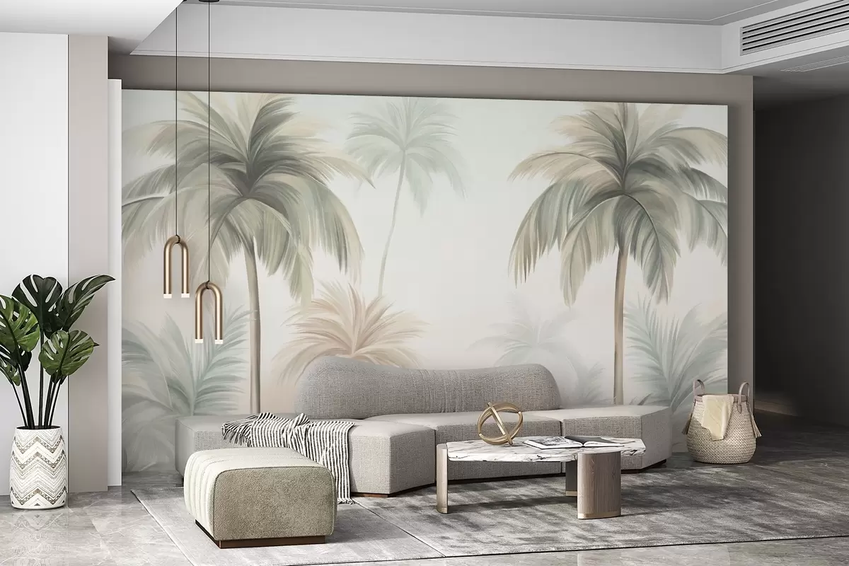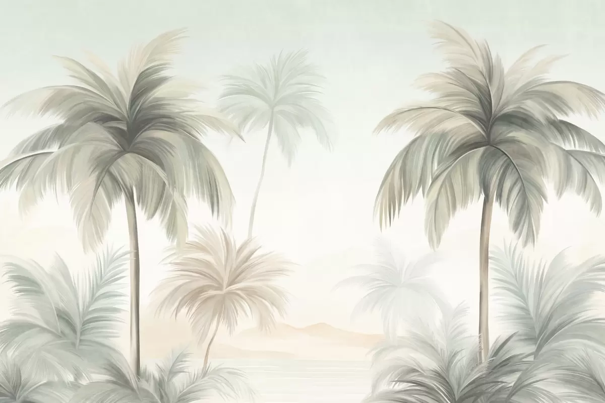 Peintures murales Des palmiers aux feuilles texturées, d'un vert et d'un beige discrets, se détachant sur un ciel clair Nr. w09770