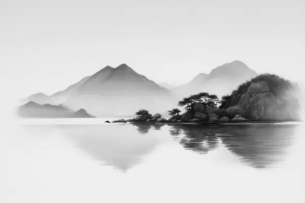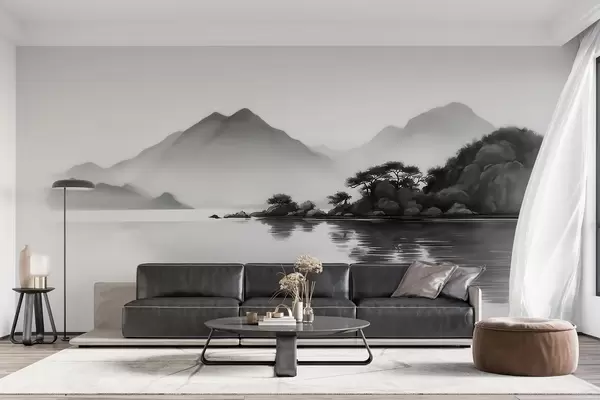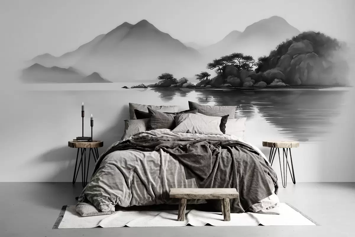 Peintures murales Paysage en noir et blanc avec des montagnes et un lac dans une brume légère Nr. w09803