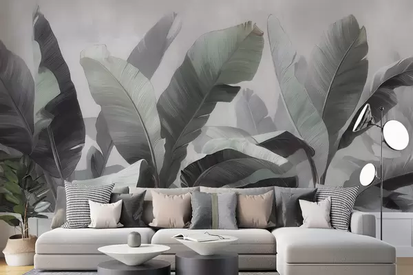 Peintures murales Grandes feuilles de bananier stylisées dans une palette neutre aux tons gris-vert doux Nr. w09805