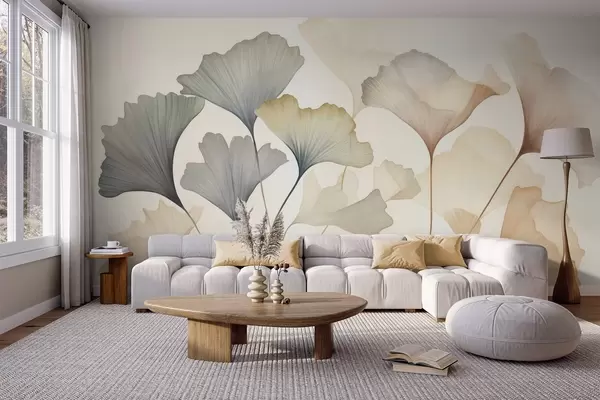 Peintures murales Feuilles de ginkgo stylisées dans des tons pastel discrets tels que le bleu, le vert et le pêche, œuvre d'art texturée Nr. w09810