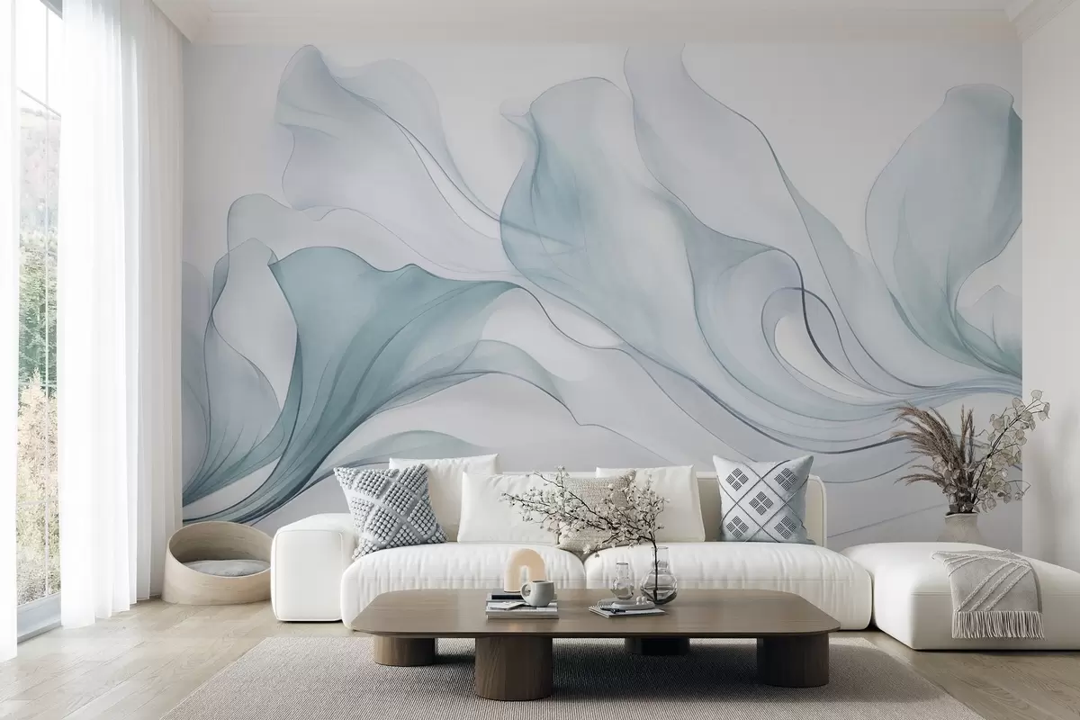 Peintures murales Une texture fluide et abstraite dans des nuances de bleu, rehaussée de lignes délicates Nr. w09815v1