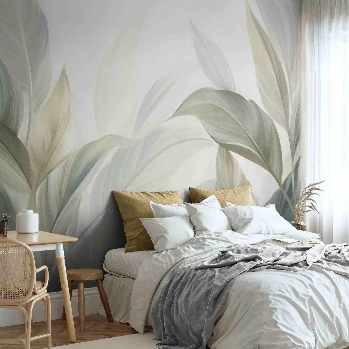 Peintures murales De grandes feuilles tropicales vert pâle aux couleurs douces et pastel, dans un style artistique texturé Nr. w09816