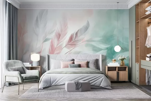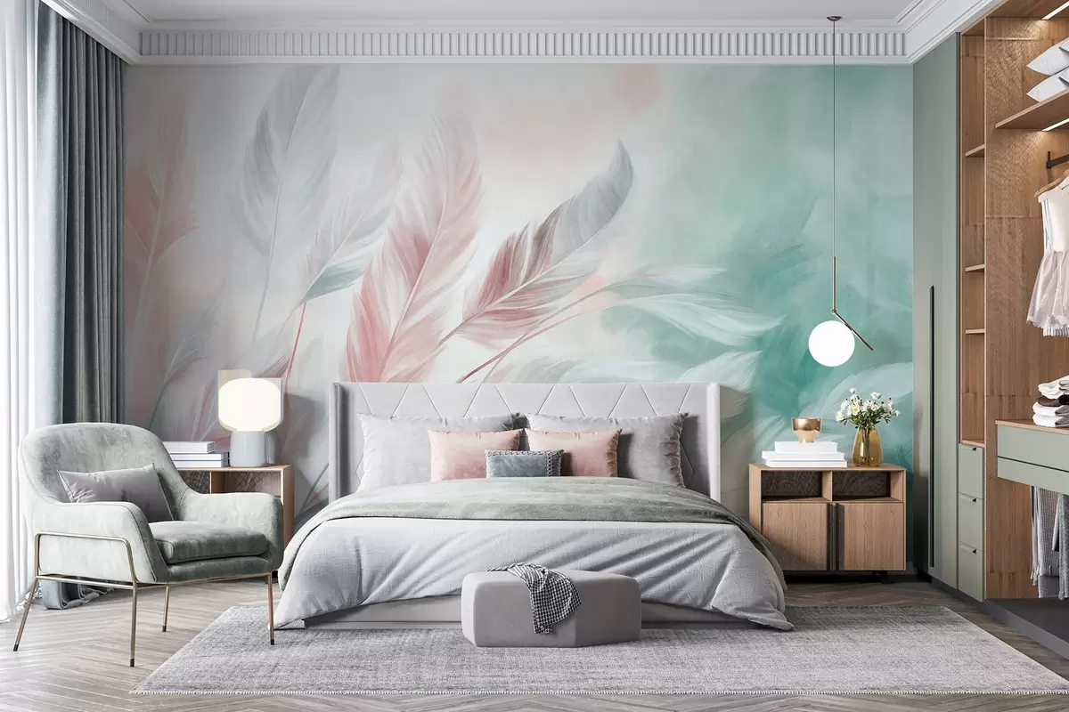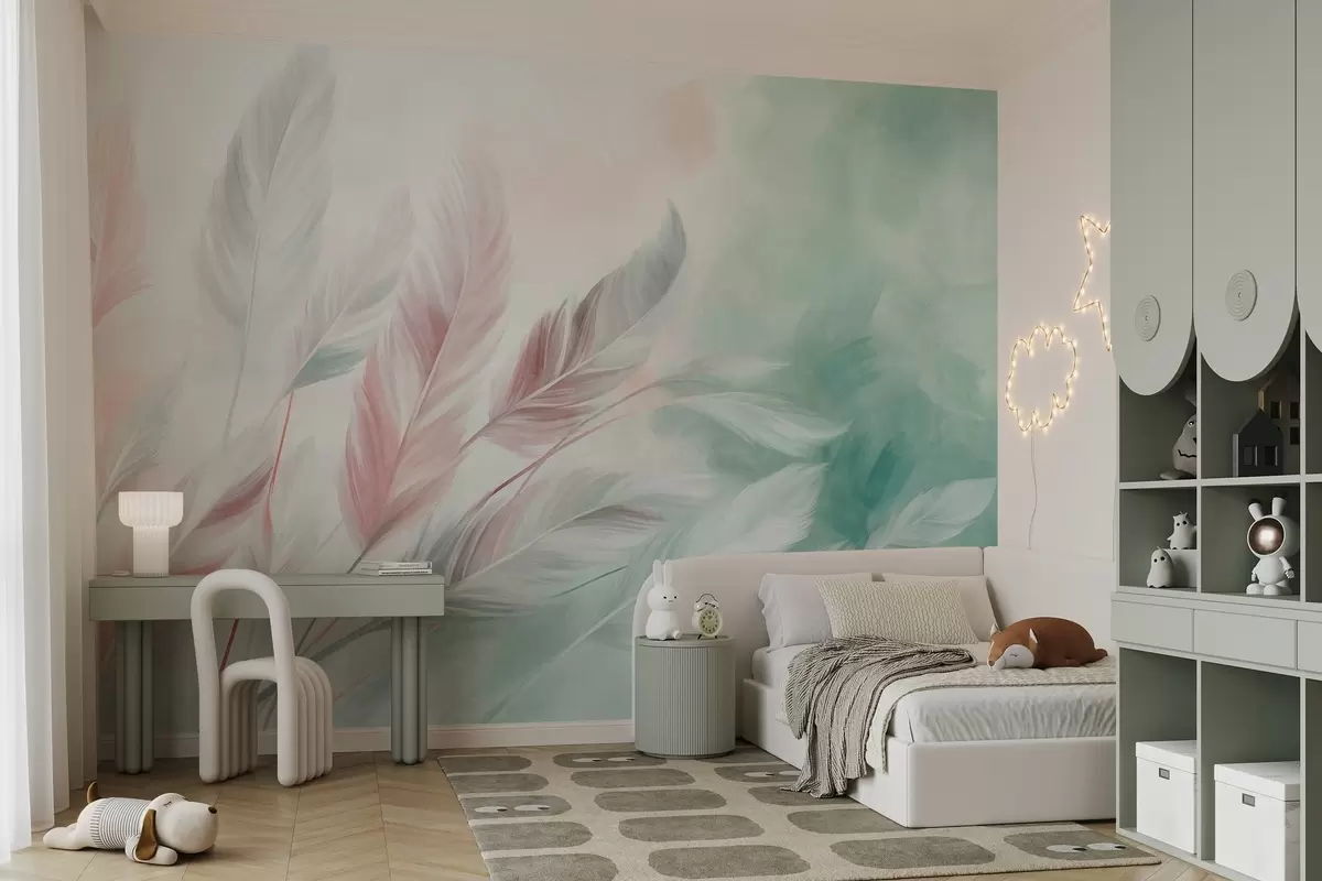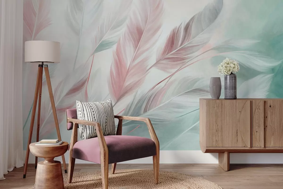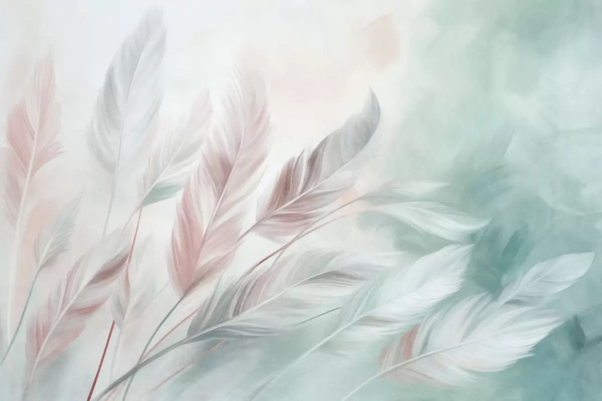 Peintures murales Des plumes aux couleurs pastel texturées, aux bords doux et vaporeux, sur un fond de style aquarelle Nr. w09833v1