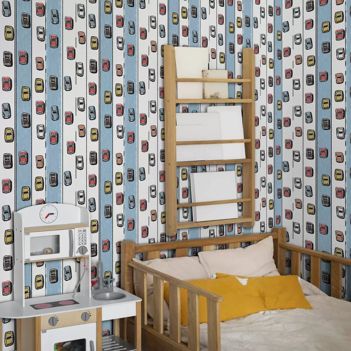 Papiers peints Voiture rétro sur une route blanche et bleue dans le style des années 60 Nr. a00118v2