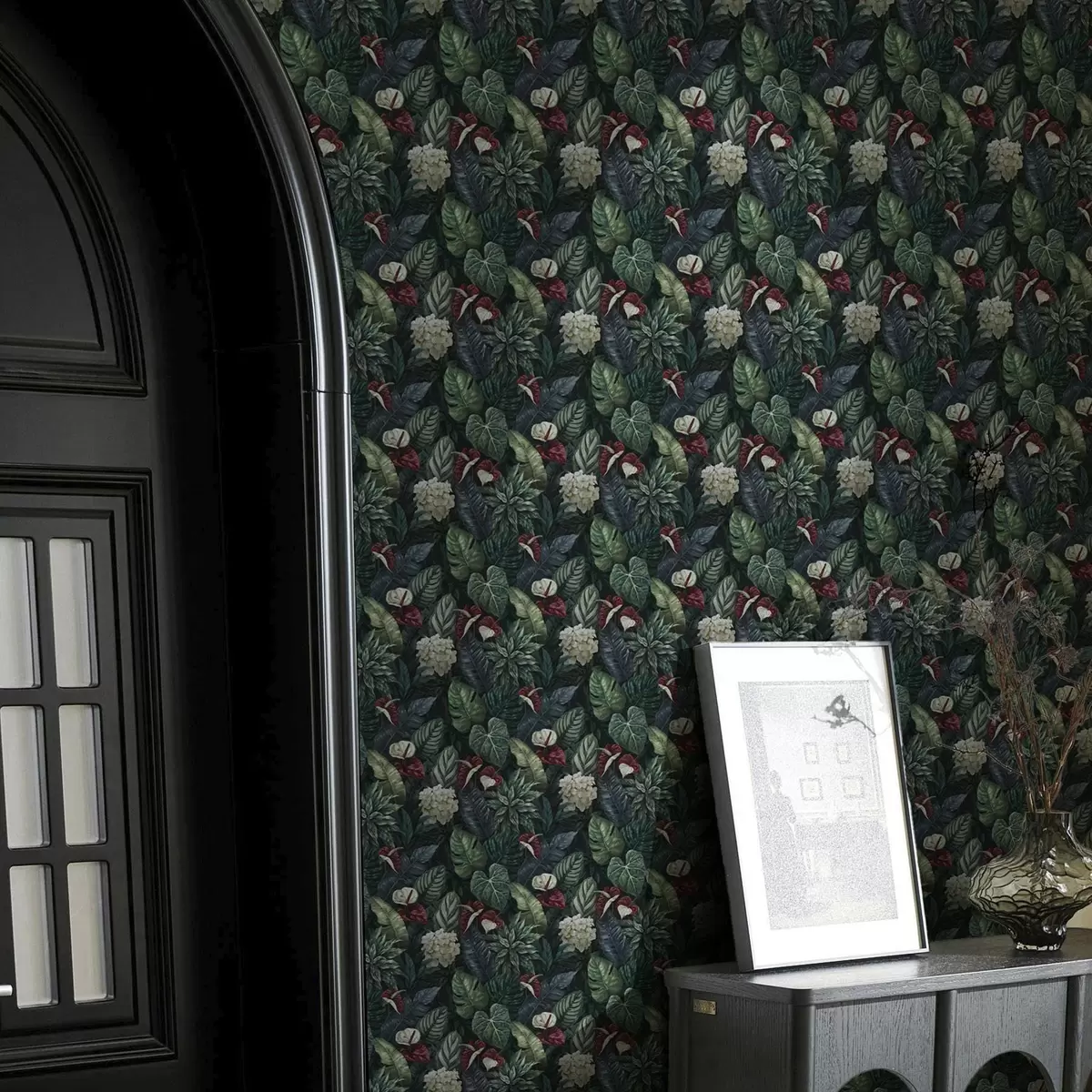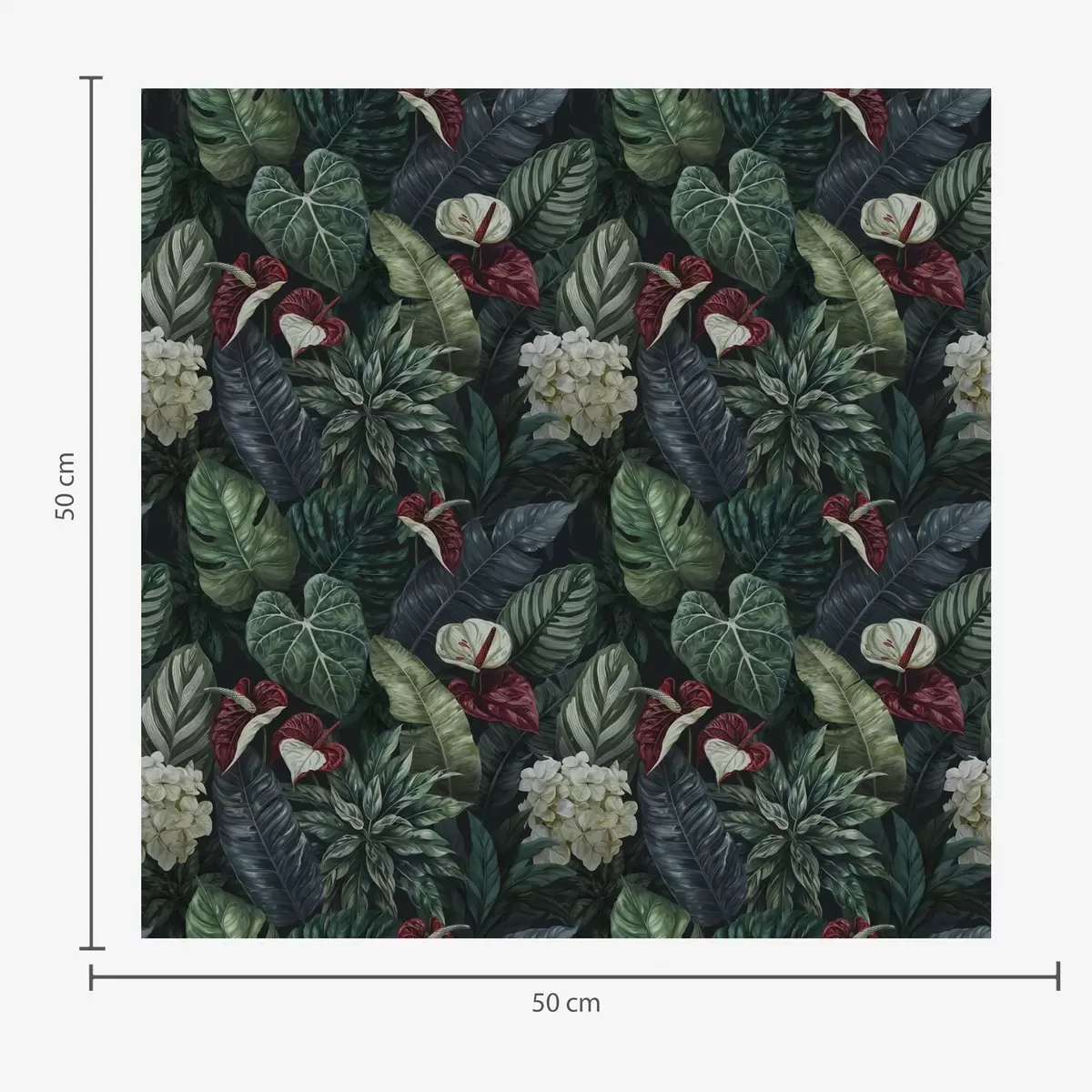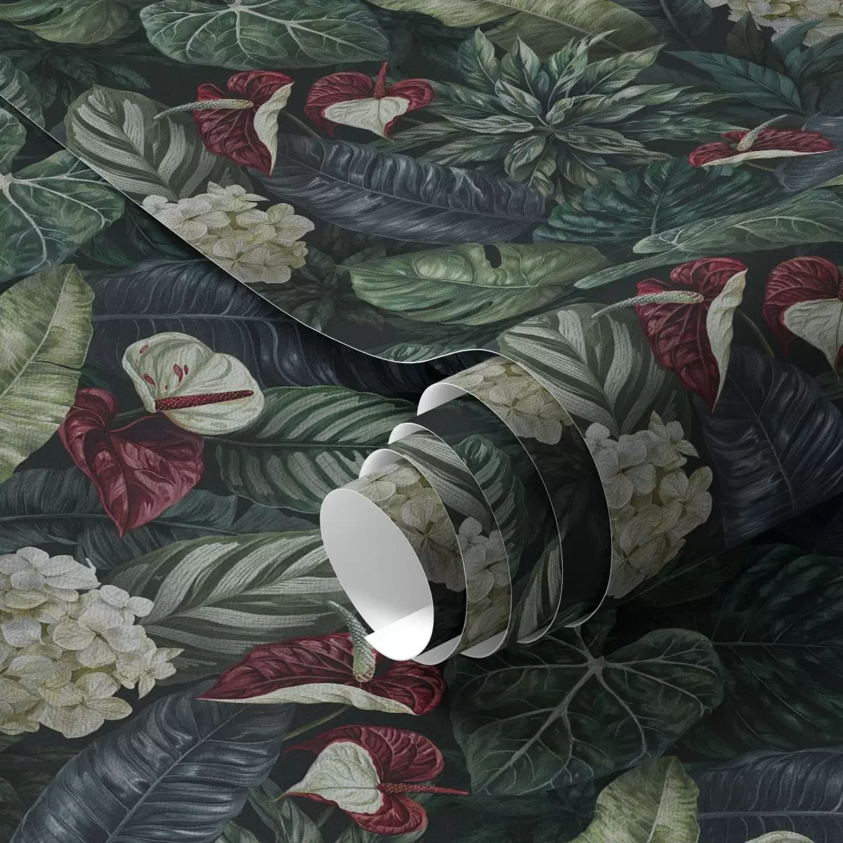 Papiers peints Feuilles tropicales avec fleurs blanches et rouges Nr. a00361