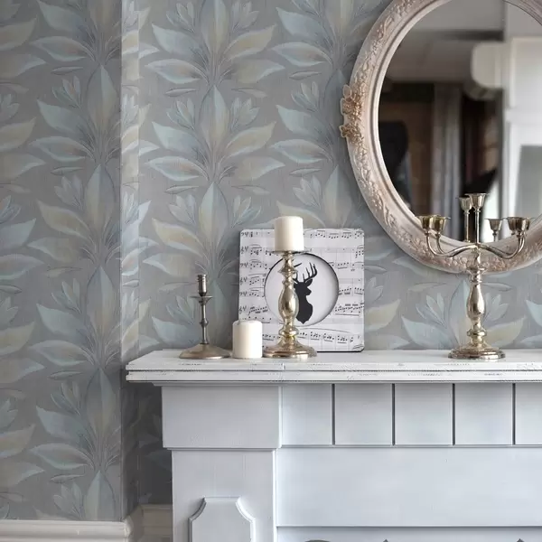 Papiers peints Grandes feuilles stylisées dans une palette bleu sable sur fond gris Nr. a00601