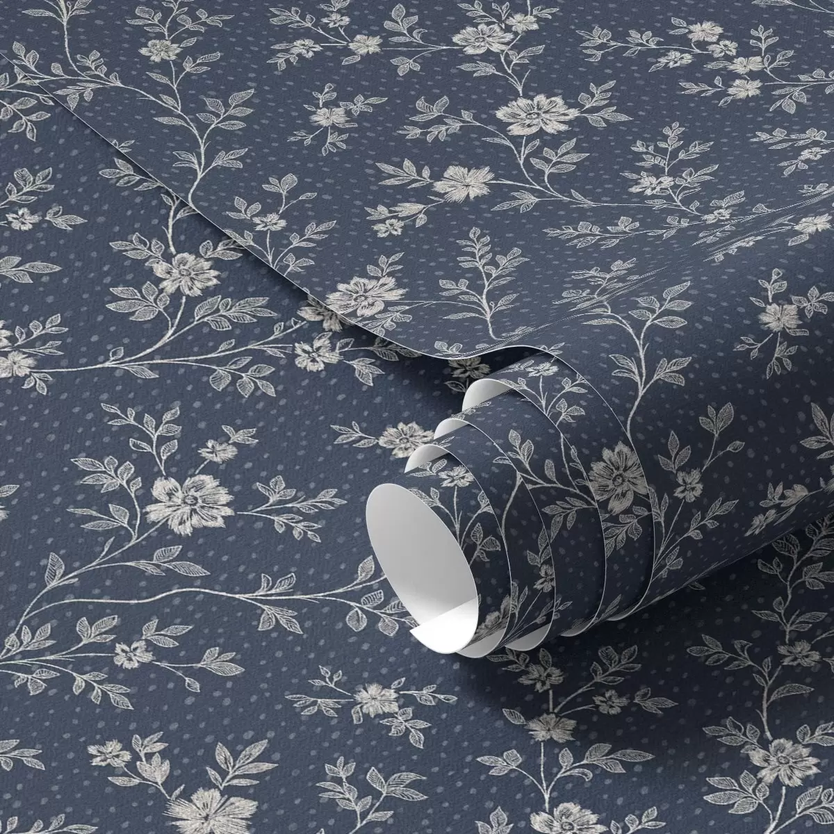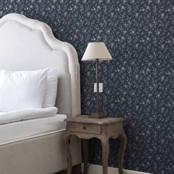 Papiers peints Fond bleu marine foncé avec de fines branches et fleurs beiges Nr. a00612