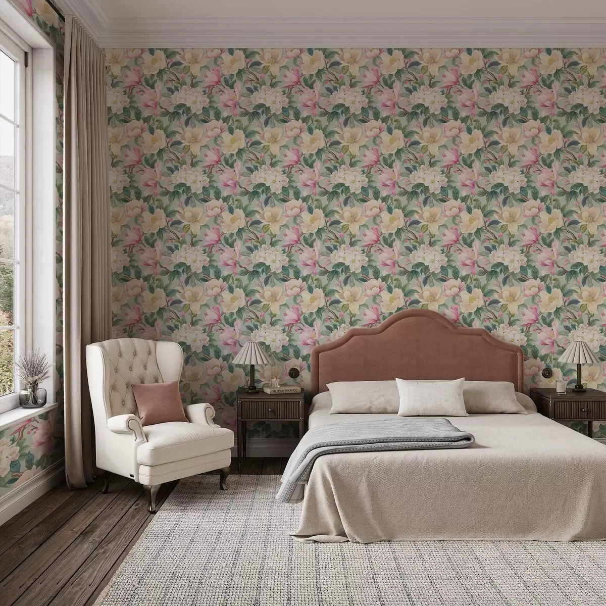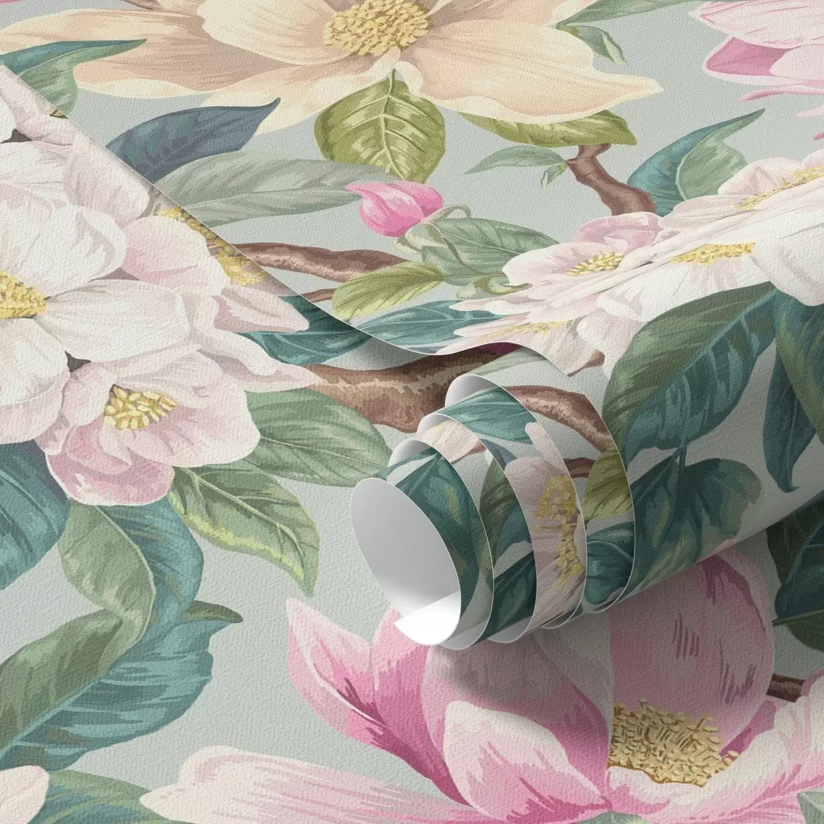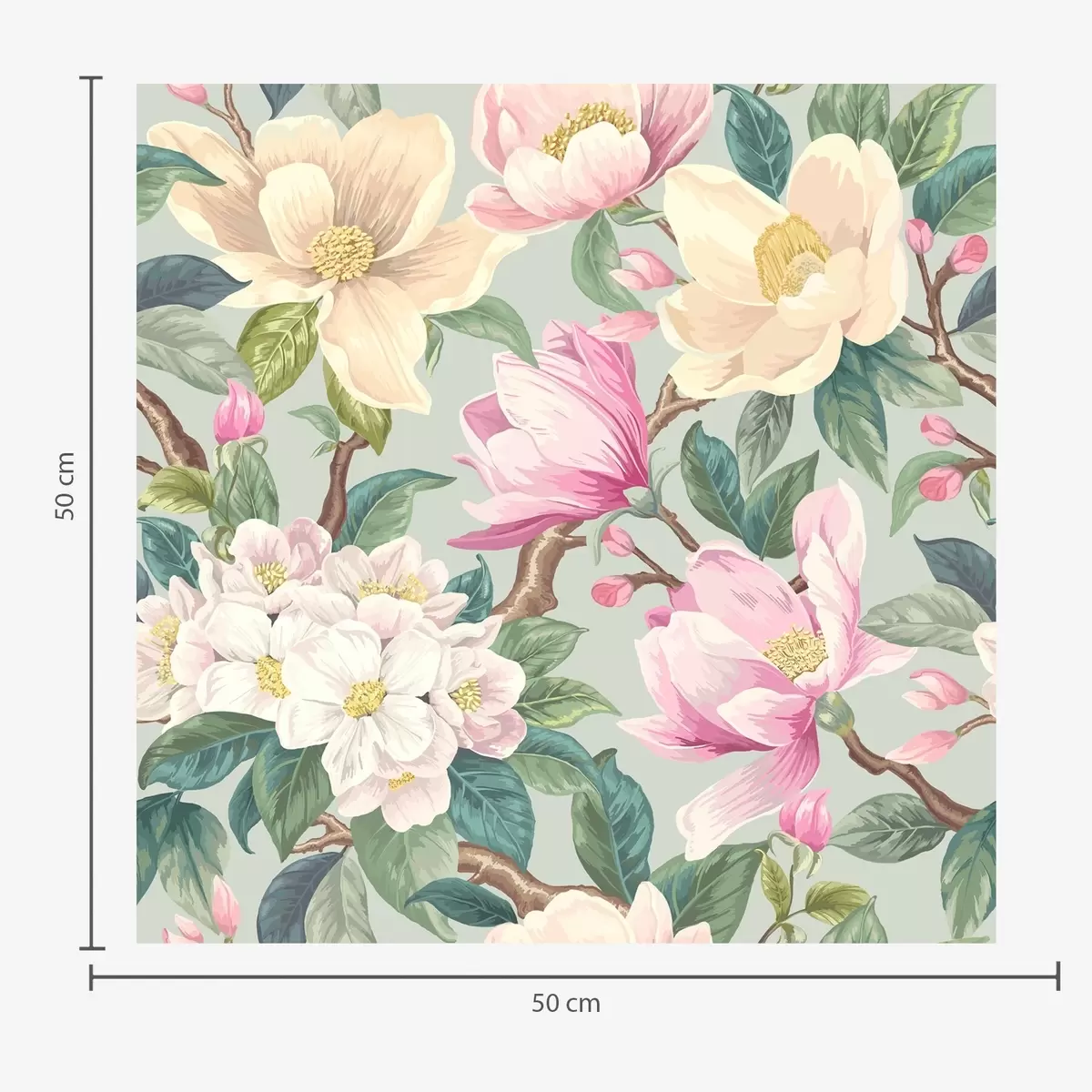 Papiers peints Magnolias et fleurs blanches sur fond gris menthe Nr. a00644