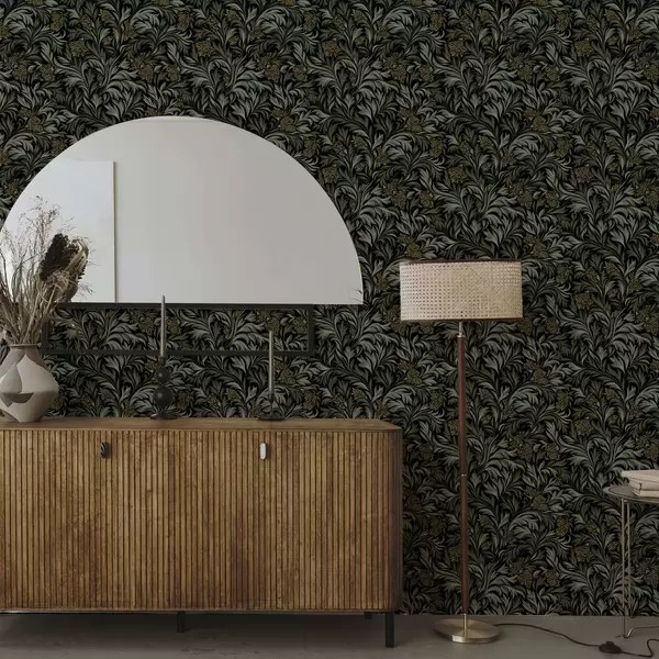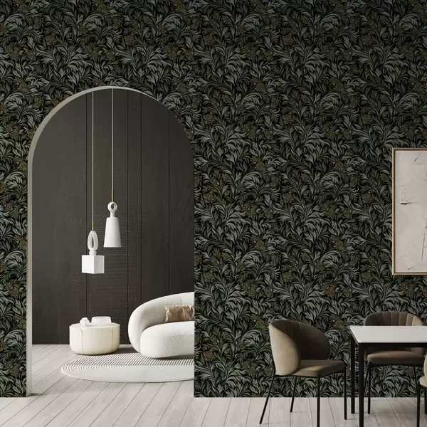 Papier peint Feuilles d'acanthe foncées avec des cônes jaunes sur fond noir a00745
