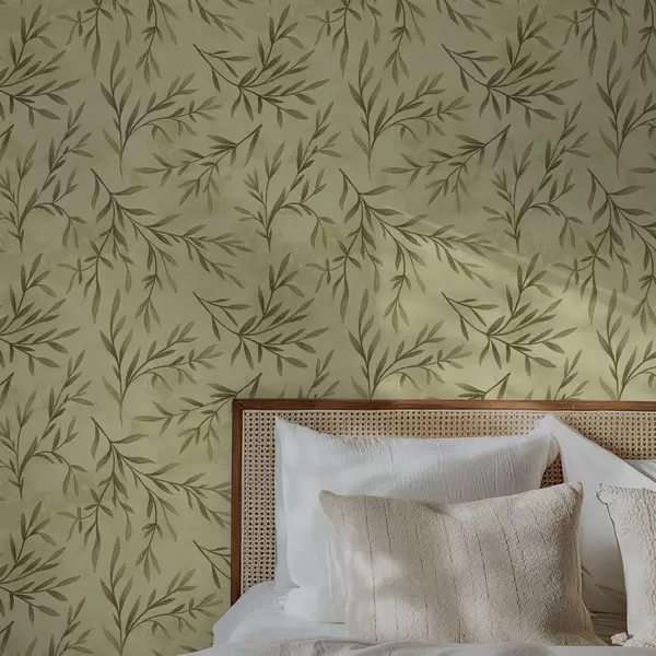 Papier peint Brins d'olivier sur fond texturé jaune-vert discret a00936