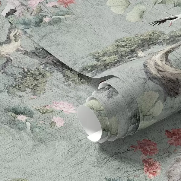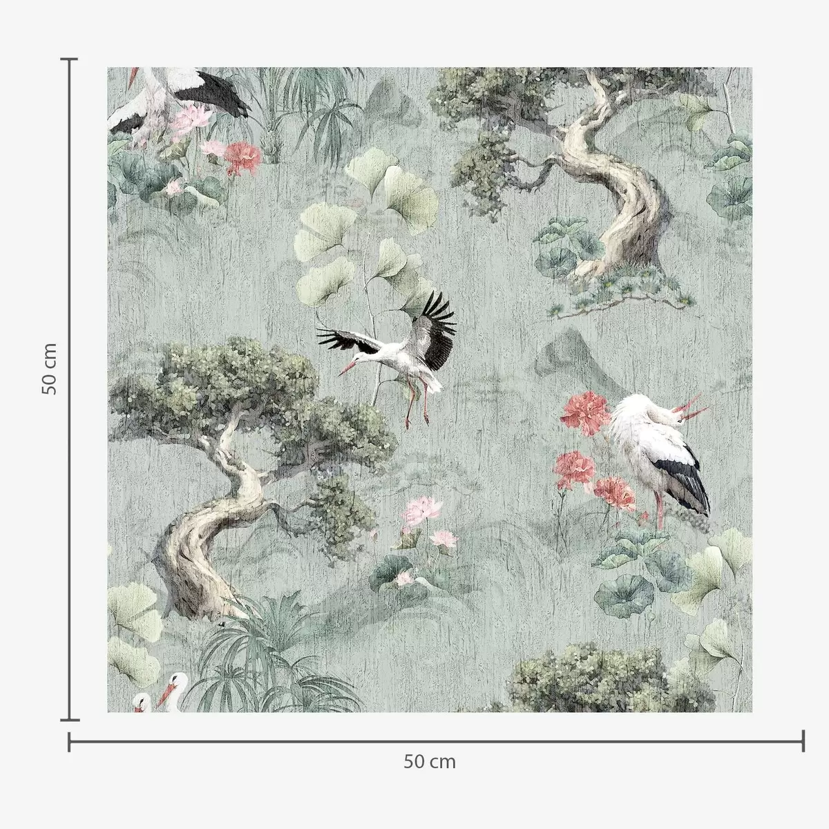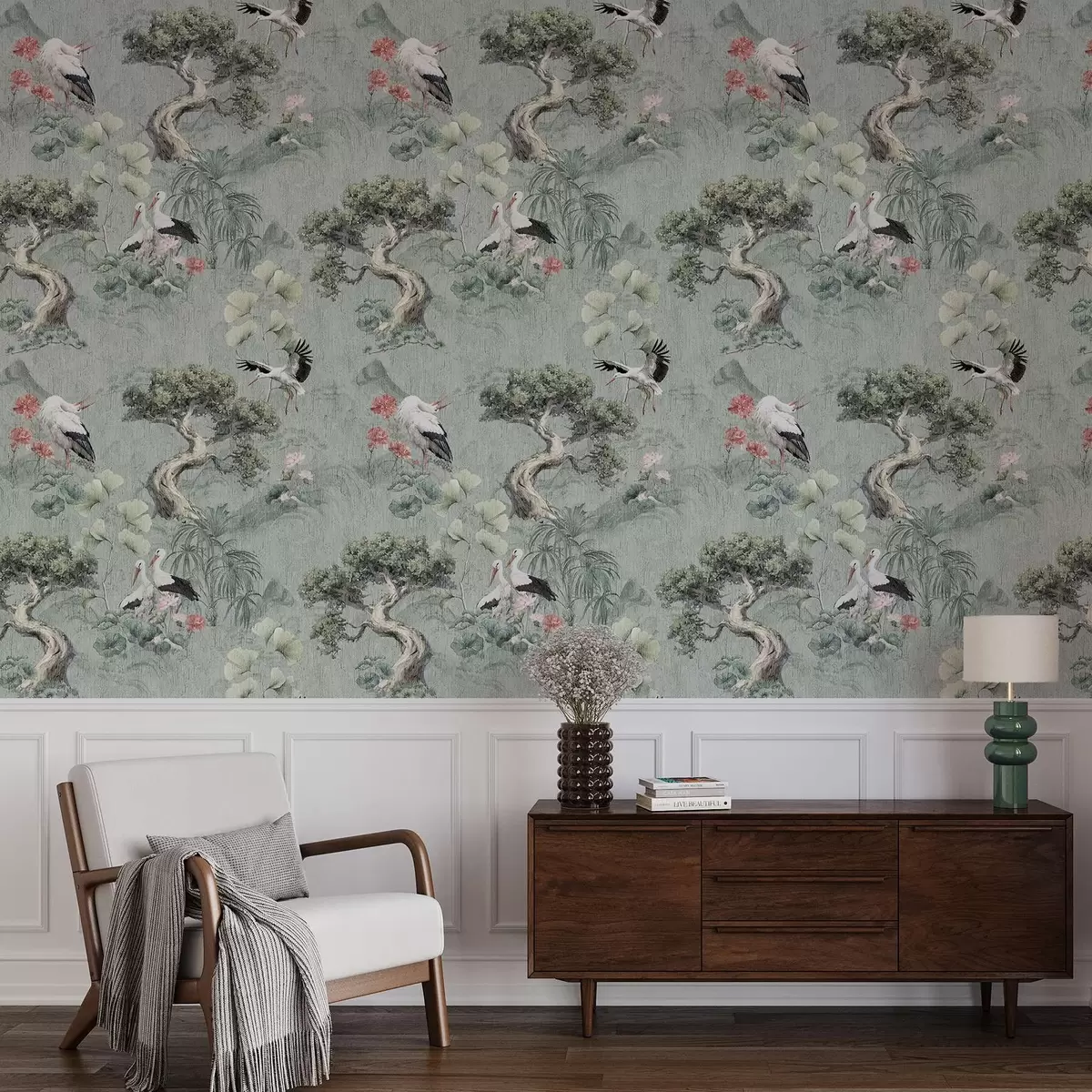 Papiers peints Grues parmi les pins et les lotus sur un fond vert apaisant Nr. a00962