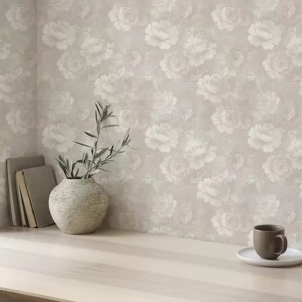 Papier peint Pivoines fanées sur texture lin dans une palette beige doux a01018